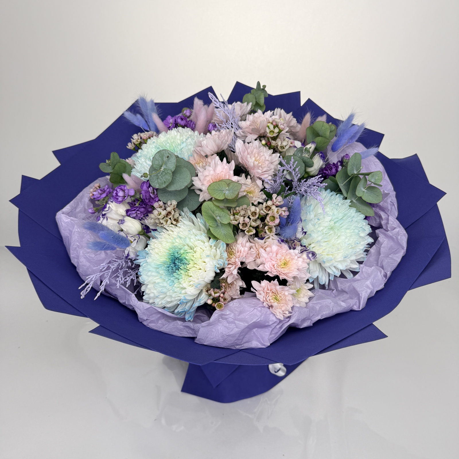 Состав: хризантема кустовая 5, лизиантус 3, маттиола 3, хризантема 3, хамелациум 2, эвкалипт 2, фисташка 0,5 и прочее. под заказ