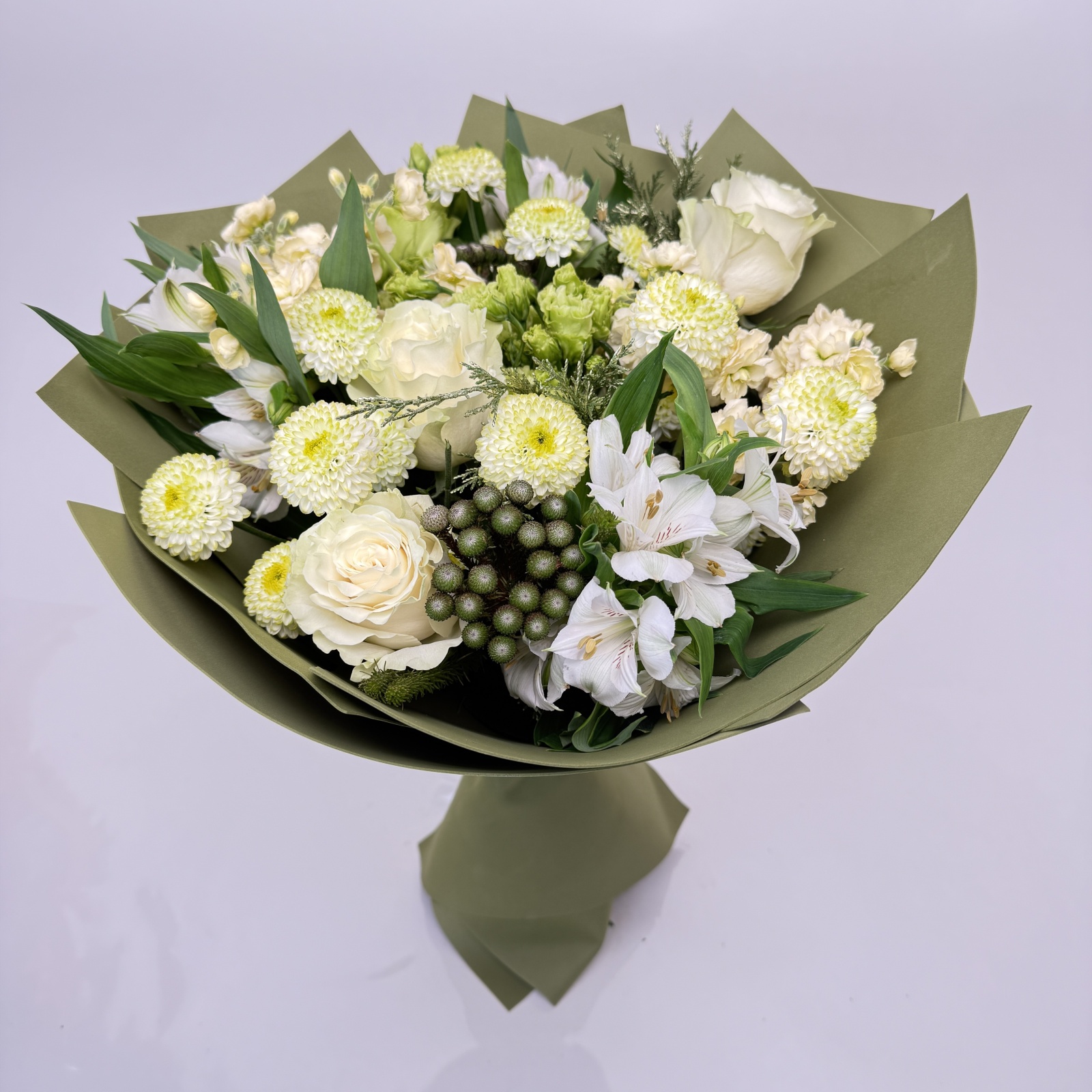 Состав: роза 3, альстромерия 3, хризантема кустовая 3, бруния 2, лизиантус 2, маттиола 2 и прочее.