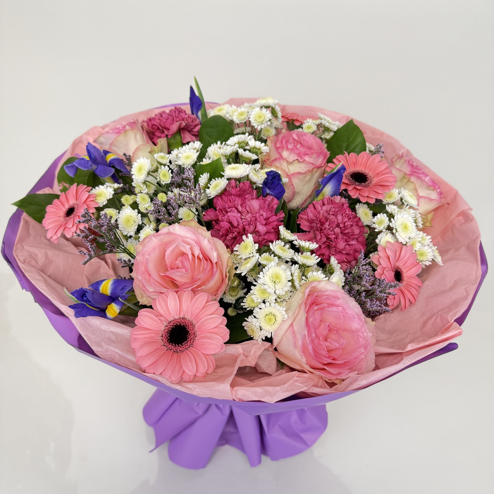 Состав: хризантема кустовая 6, гербера 5, ирис 5, роза 5, гвоздика 4, салал 0,5 и прочее. под заказ