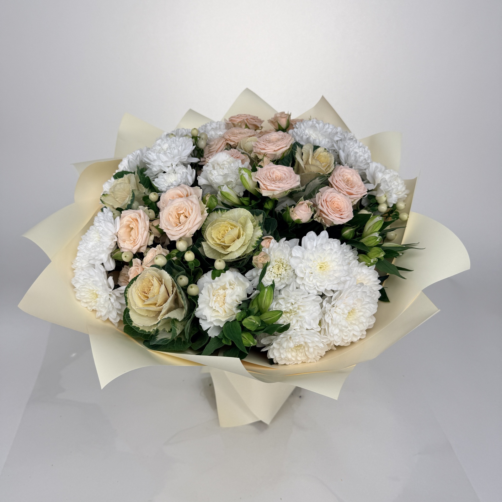 Состав: гвоздика 5, хризантема кустовая 5, альстромерия 4, гиперикум 3, роза кустовая 3, рускус 0,5 и прочее.