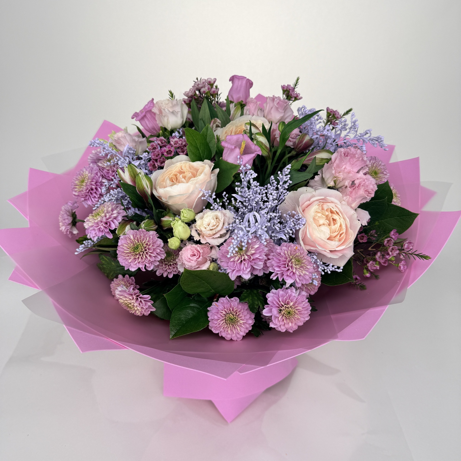 Состав: хризантема кустовая 4, роза 3, альстромерия 3, лизиантус 3, солидаго 3, хамелациум 3, салал 1, анемон 1 и прочее. под заказ