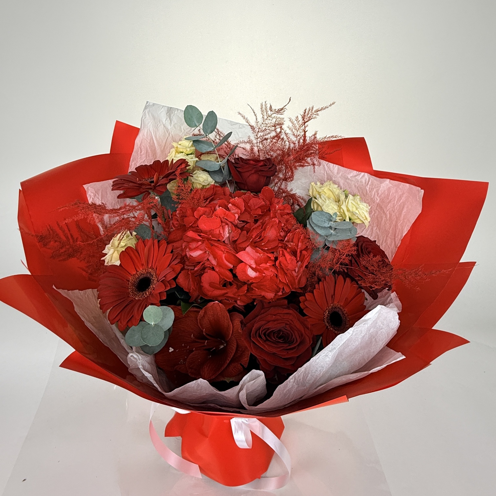 Состав: роза 3, гербера 3, лизиантус 2, гортензия 1, гиппеаструм 1, салал 0,5 и прочее.