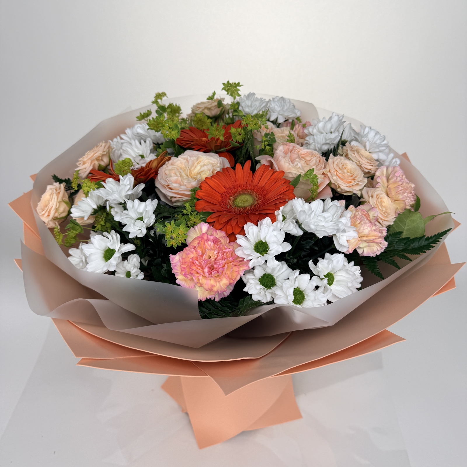 Состав: хризантема кустовая 5, гвоздика 5, роза кустовая 3, роза 3, гербера 3, маттиола 1, папоротник 0,5 и прочее. под заказ