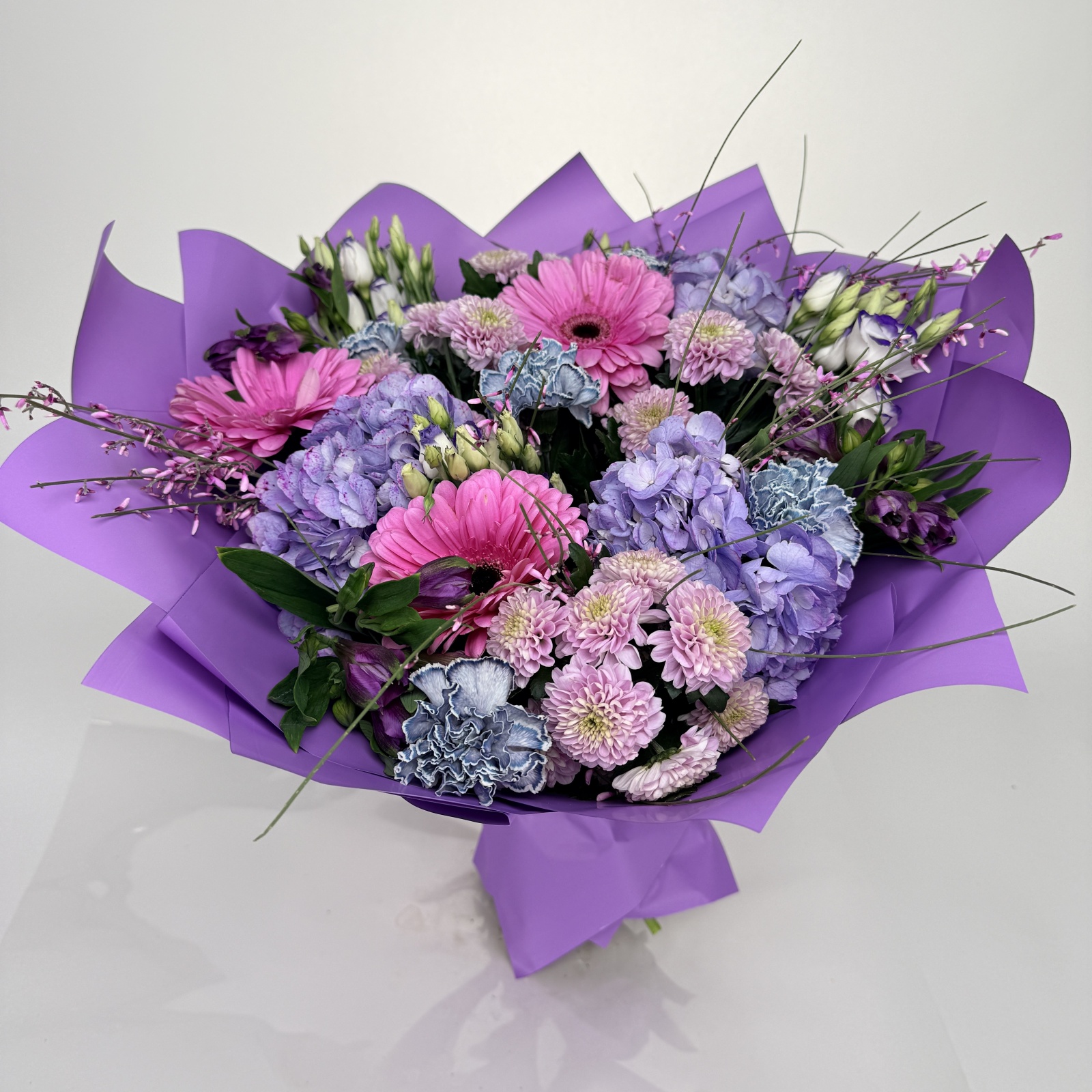 Состав: гвоздика 9, хризантема кустовая 4, гербера 3, гортензия 3, лизиантус 3, альстромерия 3 и прочее.