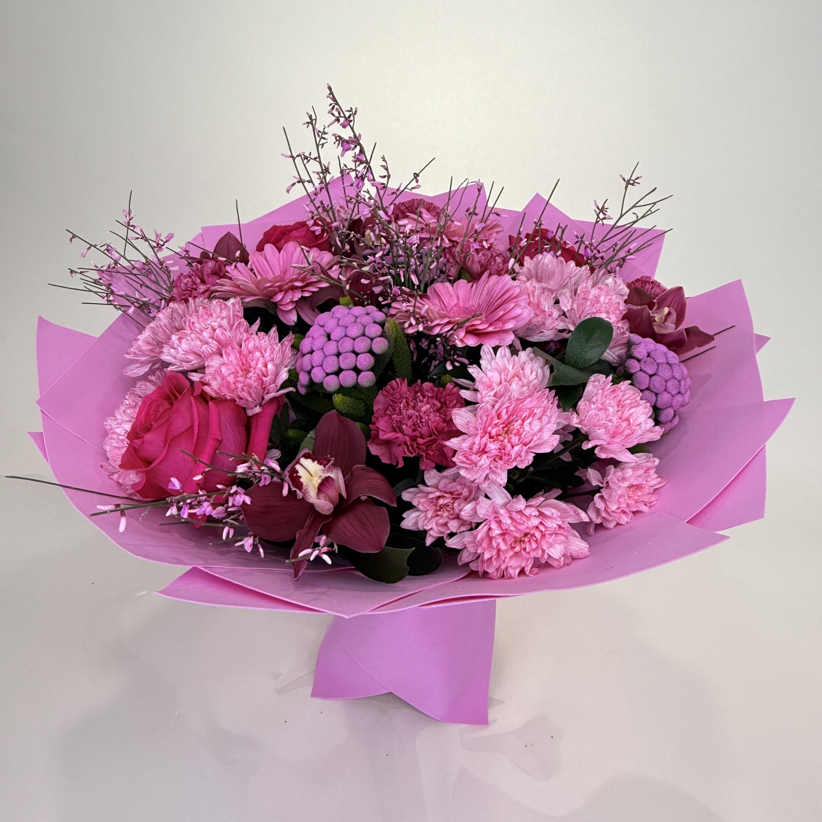 Состав: гвоздика 5, хризантема кустовая 5, гербера 3, бруния 3, роза 3, рускус 0,5, ветка цимбидиум 0,4 и прочее. под заказ