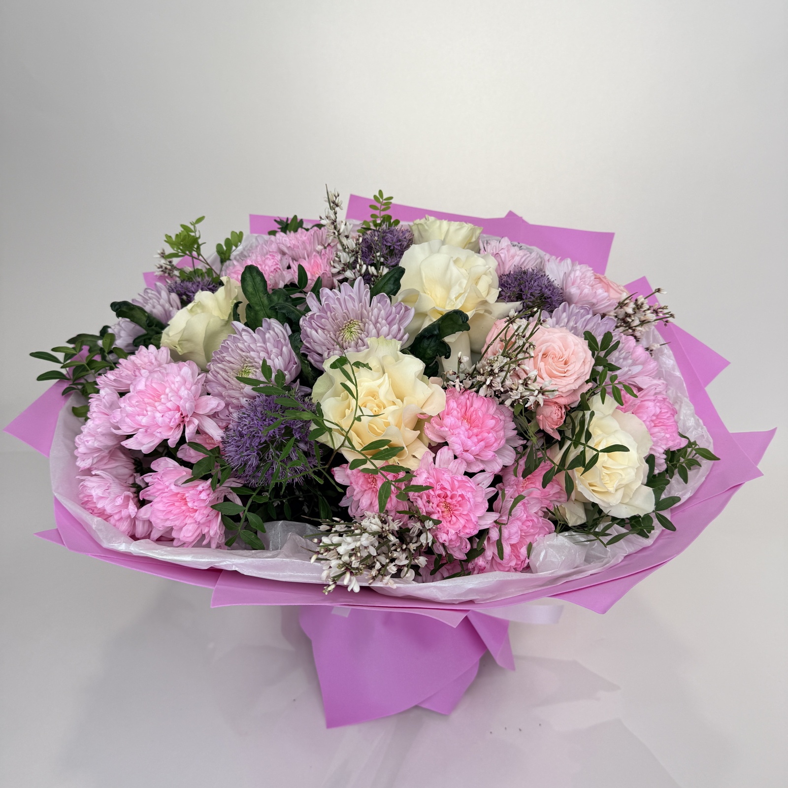 Состав: роза 5, хризантема кустовая 5, хризантема 4, роза кустовая 2, фисташка 1 и прочее.