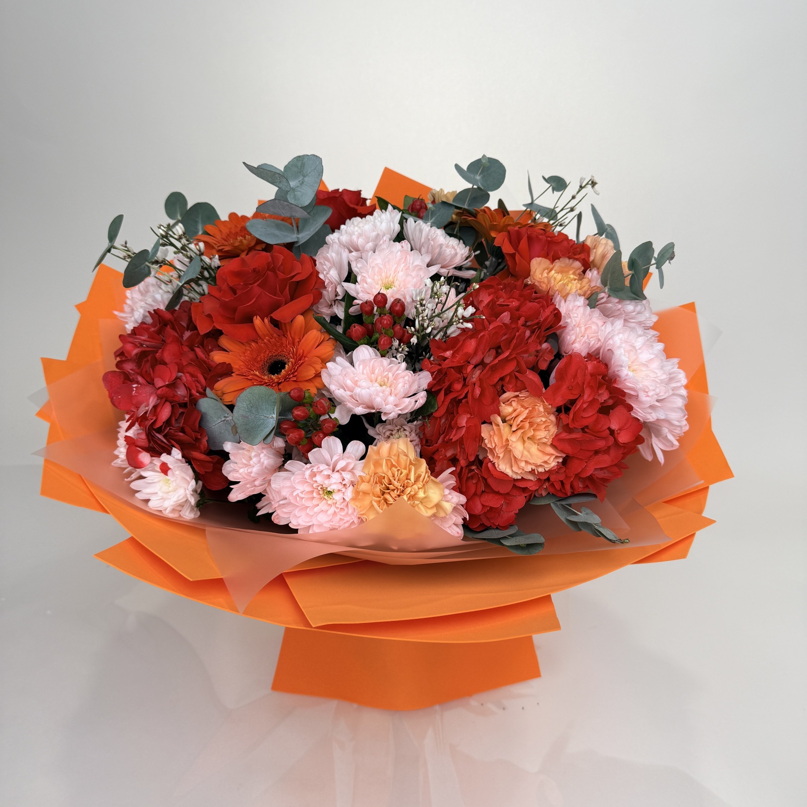 Состав: гвоздика 11, хризантема кустовая 5, гербера 3, гортензия 3, гиперикум 3, роза 3, эвкалипт 2, фисташка 1 и прочее. под заказ