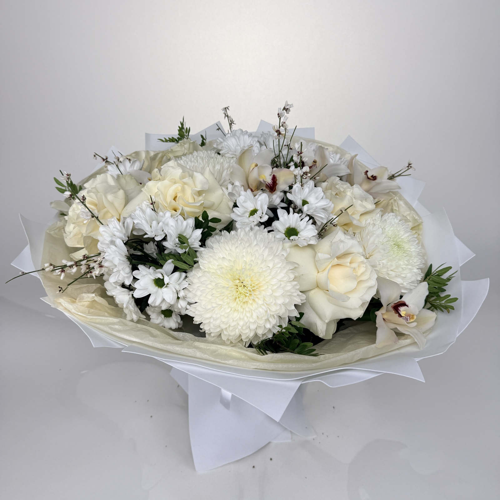 Состав: роза 7, хризантема кустовая 5, хризантема 3, фисташка 1, ветка цимбидиум 0,5 и прочее.