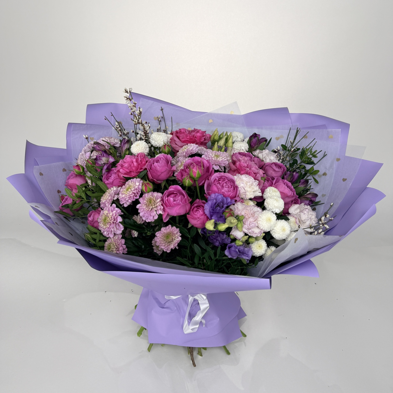 Состав: хризантема кустовая 6, гвоздика 5, роза кустовая 3, роза 3, альстромерия 3, лизиантус 2, фисташка 1 и прочее. под заказ