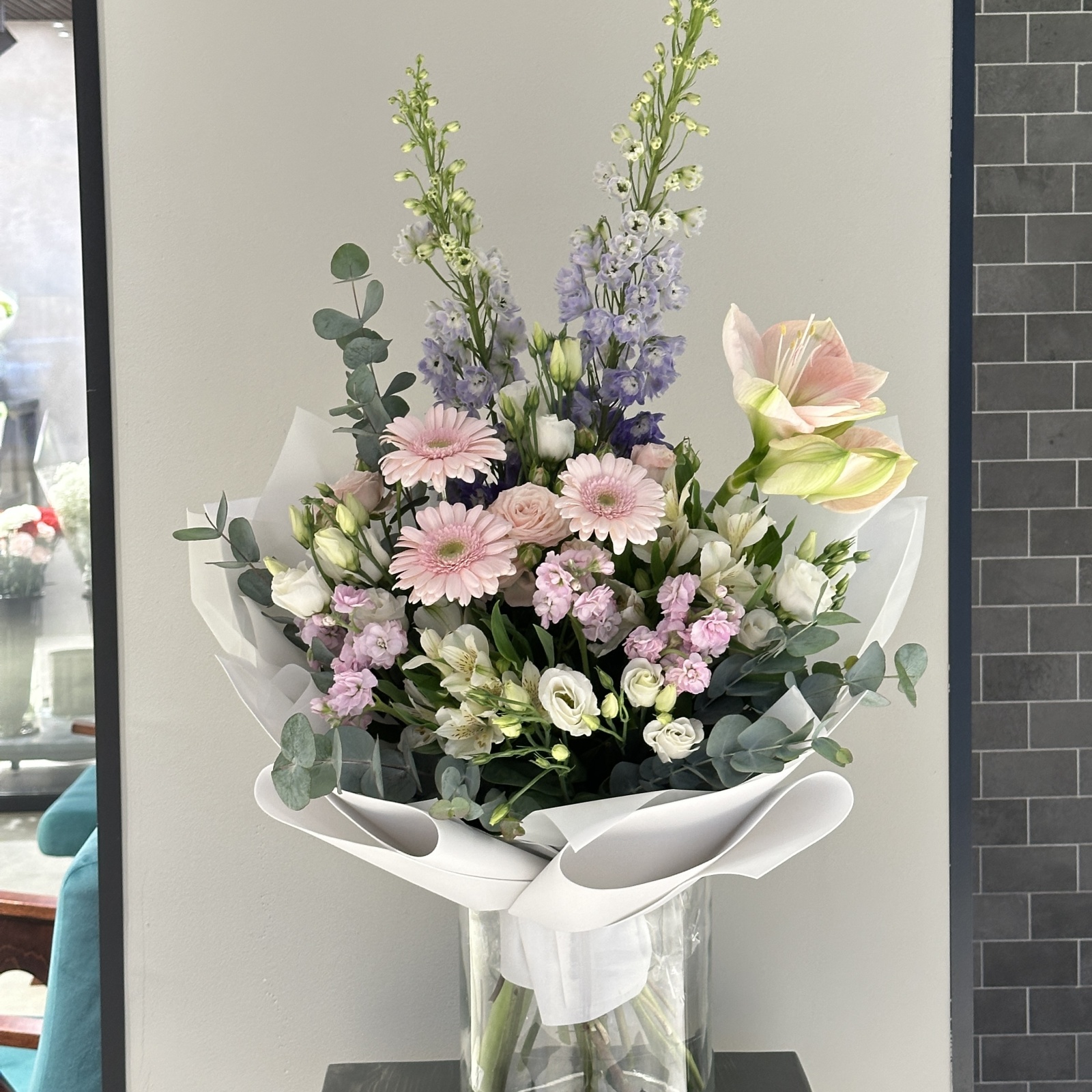 Состав: гербера 2, альстромерия 2, дельфиниум 2, лизиантус 2, маттиола 2, эвкалипт 1, роза кустовая 1, рускус 1 и прочее. под заказ