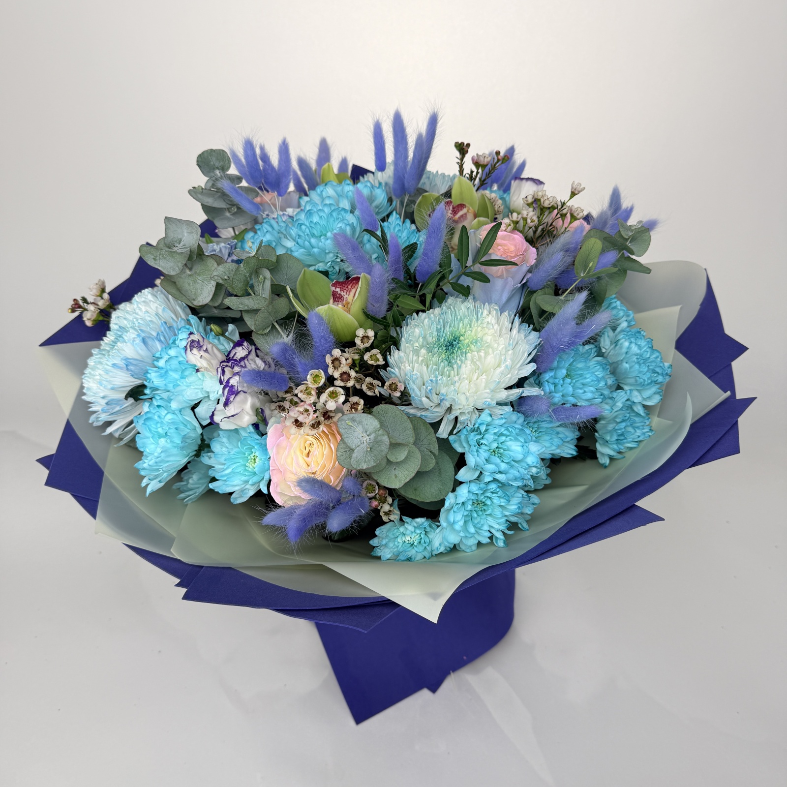 Состав: роза 5, хризантема кустовая 5, лизиантус 3, хризантема 3, хамелациум 2, эвкалипт 2, ветка цимбидиум 0,2 и прочее. под заказ
