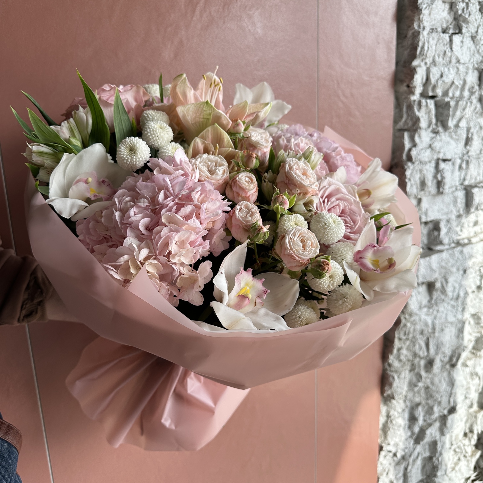Состав: хризантема кустовая 5, альстромерия 4, роза 3, роза кустовая 2, гортензия 2, рускус 0,5, ветка цимбидиум 0,4 и прочее. под заказ