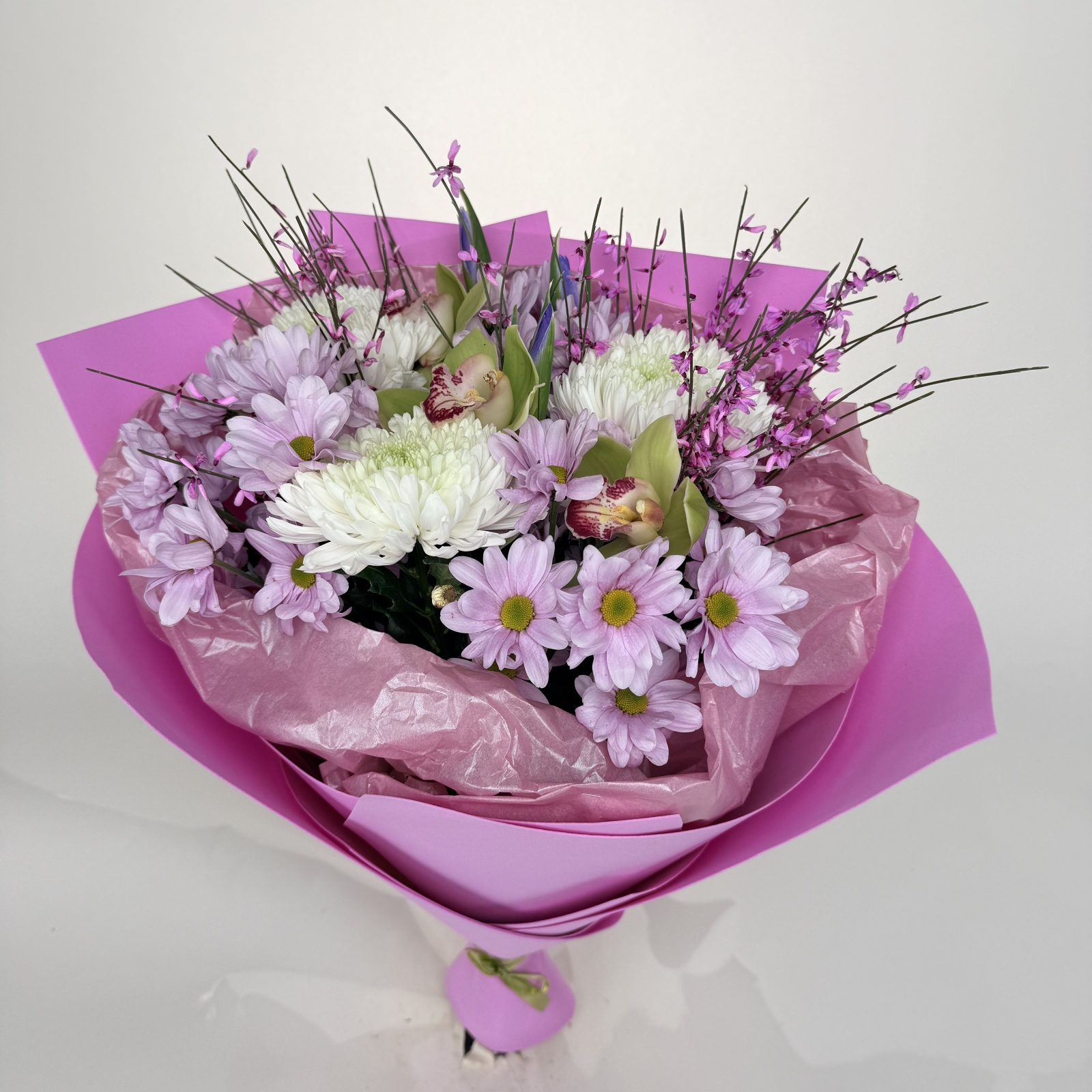 Состав: хризантема 4, хризантема кустовая 3, ветка цимбидиум 0,2 и прочее. под заказ