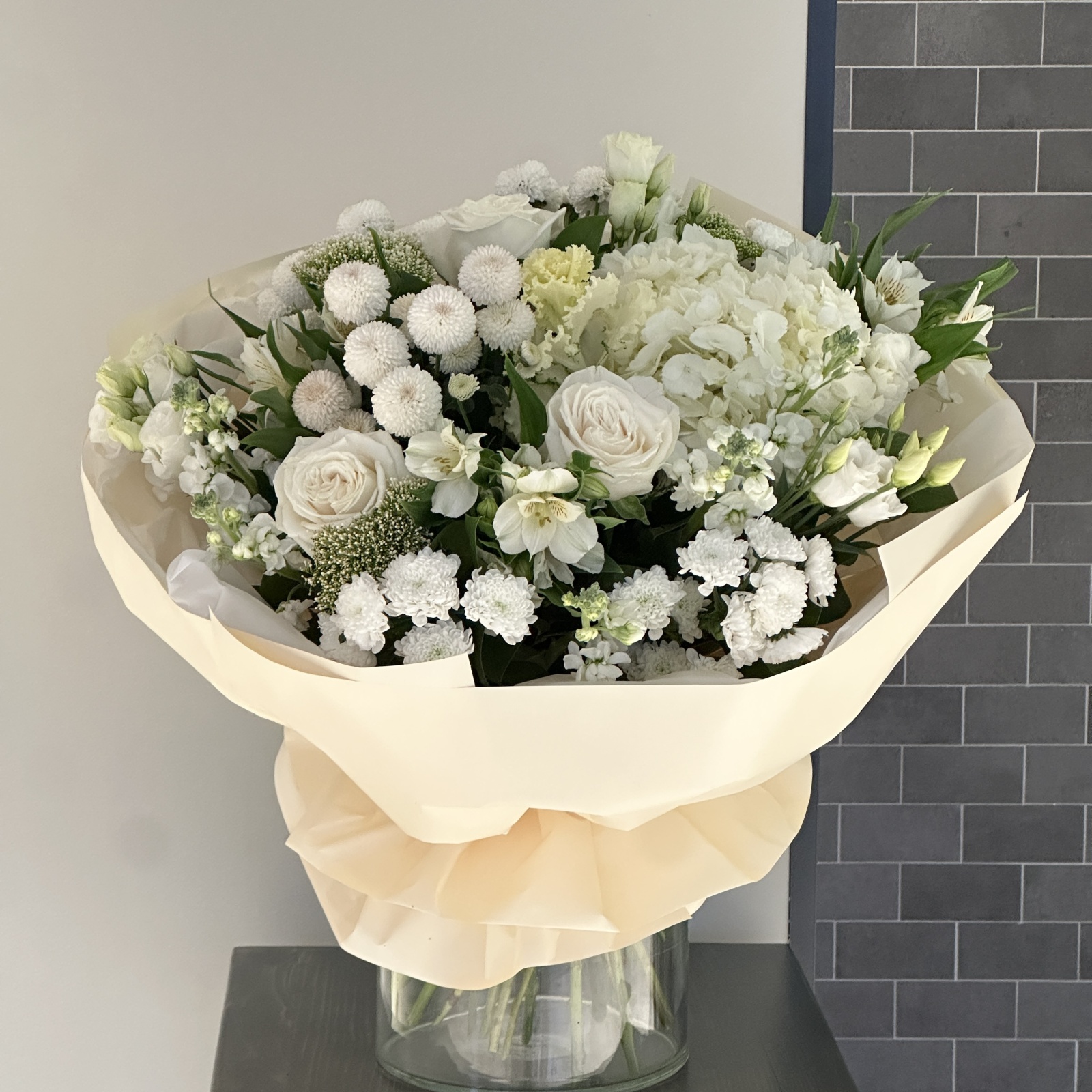 Состав: маттиола 4, лизиантус 3, хризантема 3, роза 3, альстромерия 3, хризантема кустовая 3, гортензия 1, салал 1 и прочее. под заказ