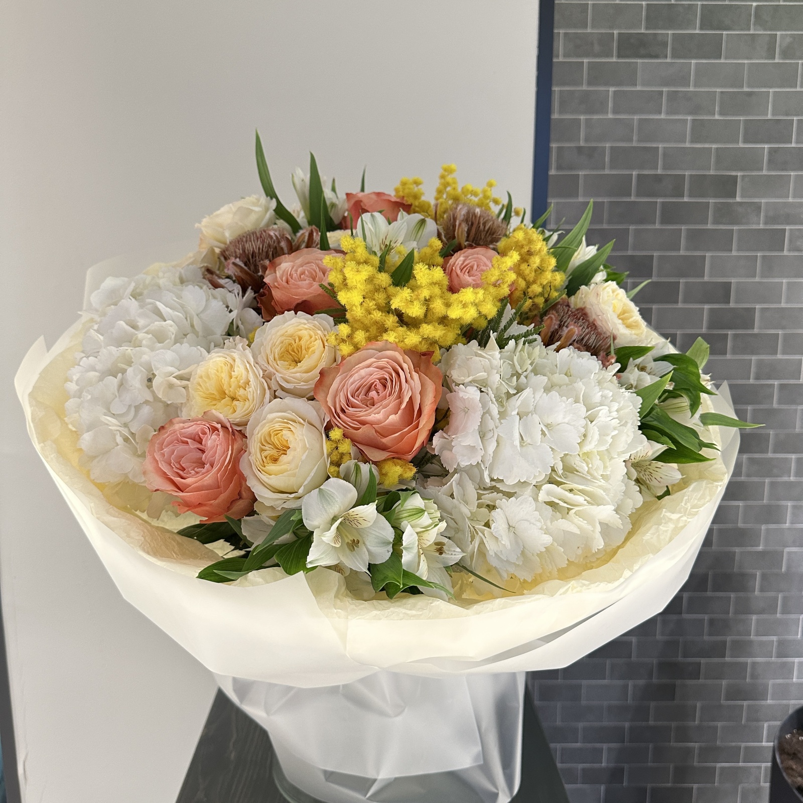 Состав: альстромерия 5, роза 4, роза кустовая 3, гортензия 2, рускус 1 и прочее.