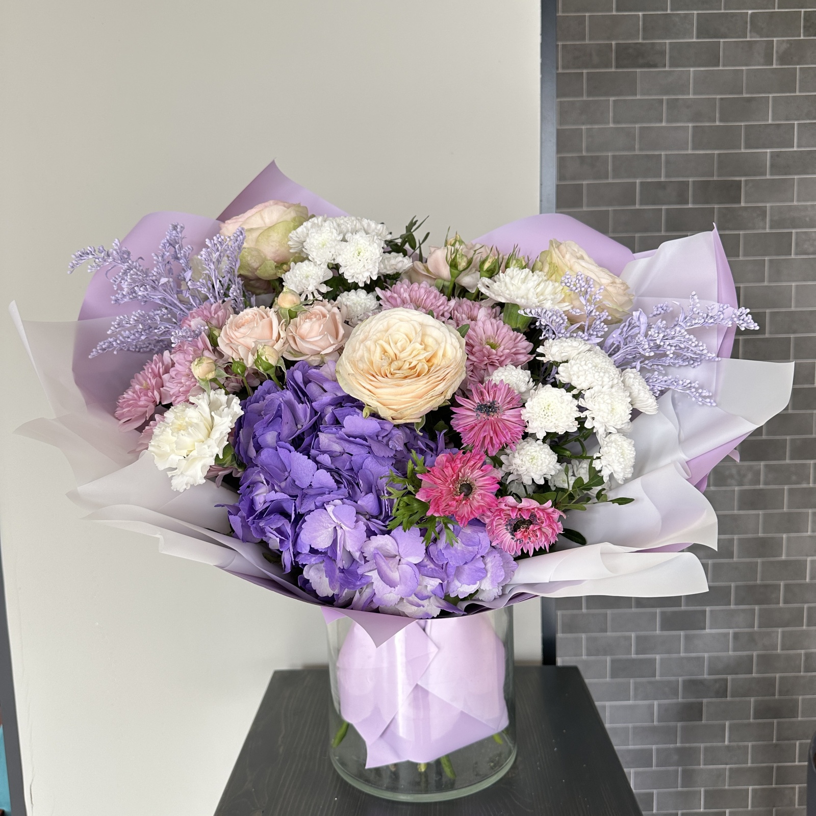 Состав: роза 3, гвоздика 3, анемон 3, хризантема 2, солидаго 2, роза кустовая 2, хризантема кустовая 2, гортензия 1, рускус 0,5 и прочее. под заказ
