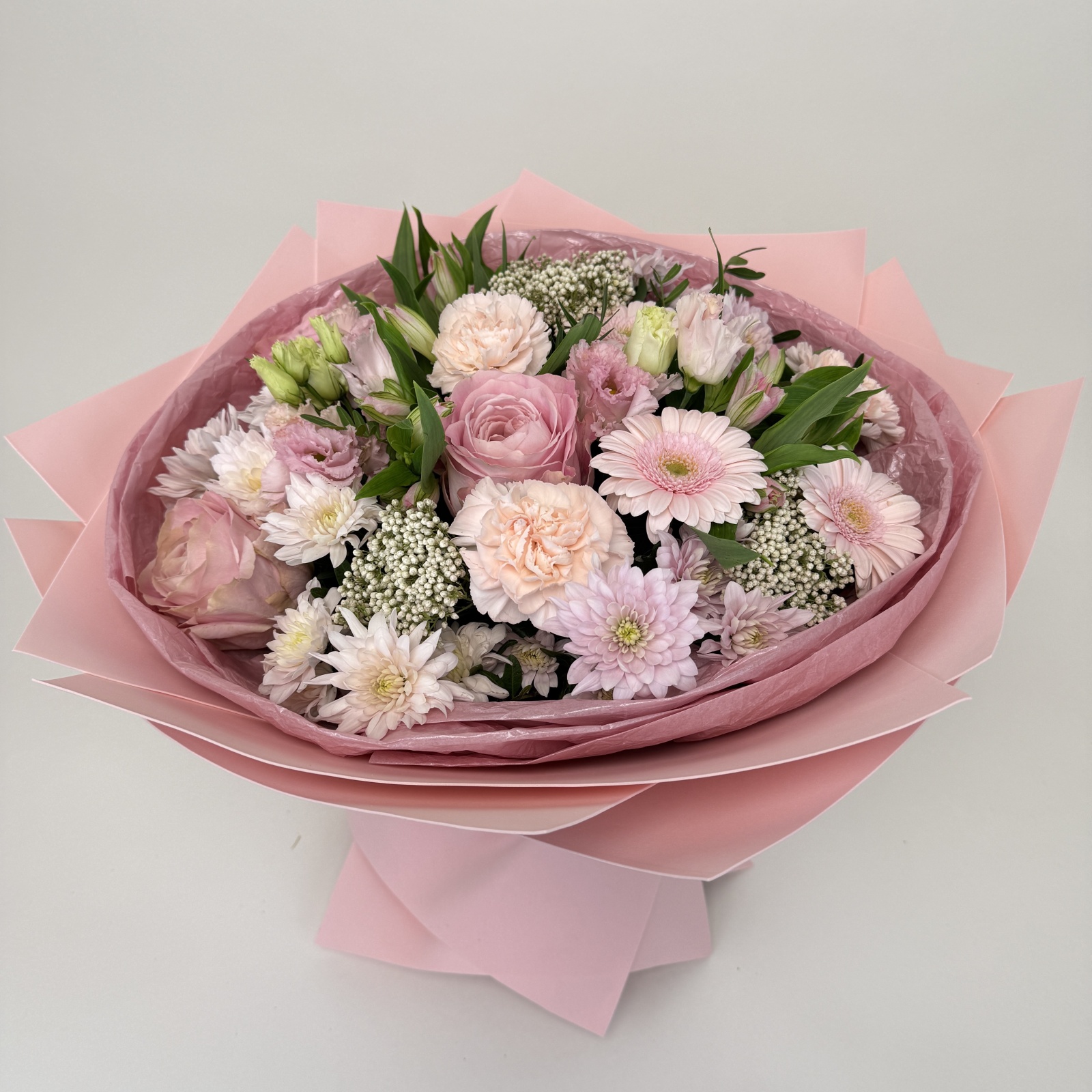 Состав: роза 6, хризантема кустовая 4, гербера 3, альстромерия 3, гвоздика 3, лизиантус 1, фисташка 0,4 и прочее.