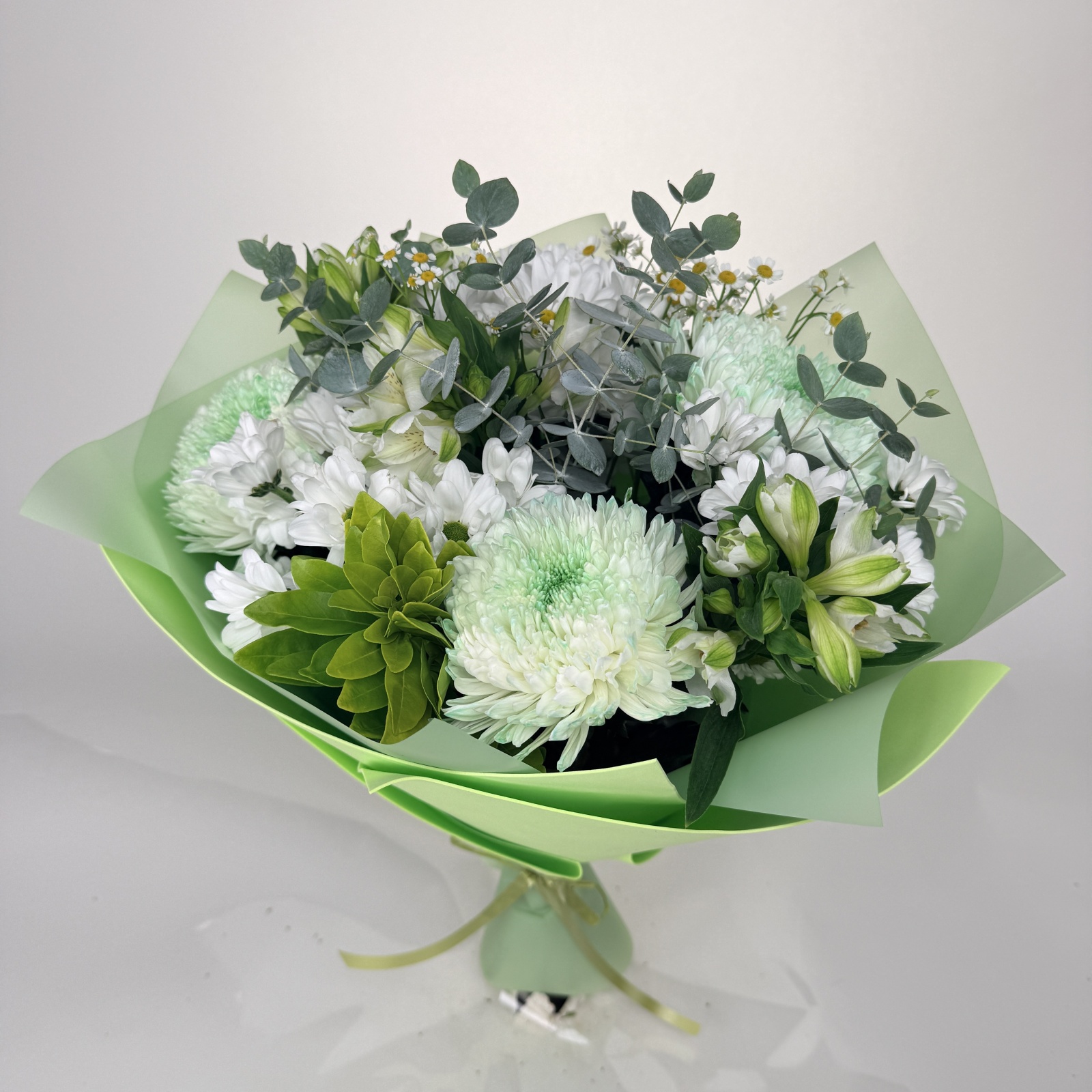 Состав: хризантема кустовая 3, хризантема 3, альстромерия 2, роза 1, чоисия 1, эвкалипт 1 и прочее.