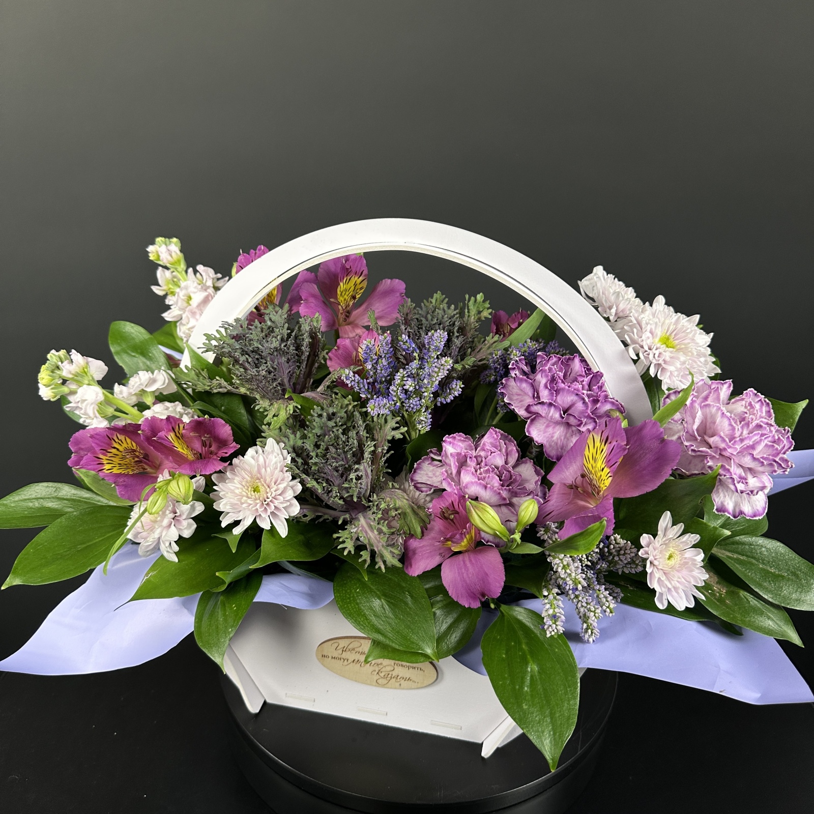 Состав: гвоздика 8, альстромерия 2, маттиола 2, хризантема кустовая 1, рускус 0,3 и прочее.