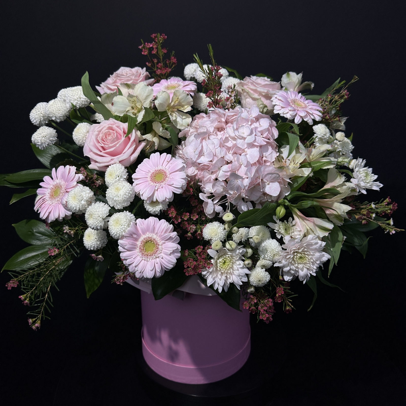 Состав: роза 8, гербера 5, альстромерия 3, хризантема кустовая 3, гортензия 1, рускус 0,5 и прочее. под заказ