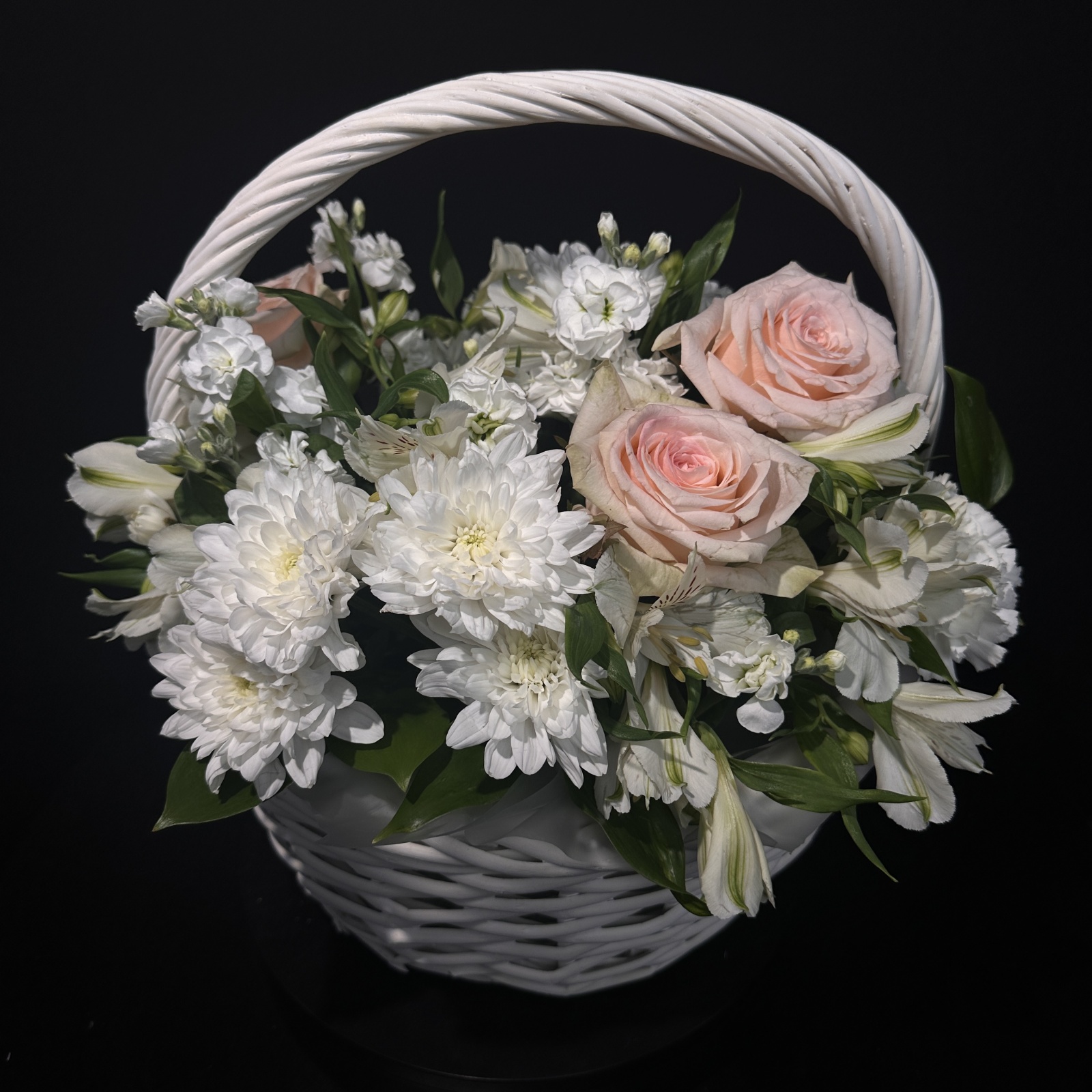 Состав: альстромерия 5, роза 3, хризантема 2, маттиола 2, гвоздика 1 и прочее.