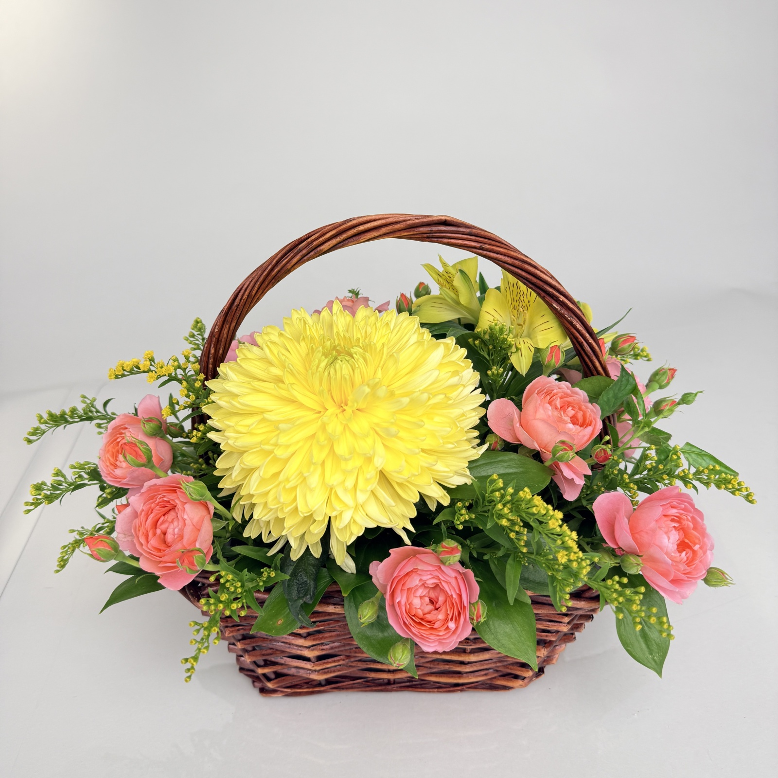 Состав: хризантема 1, альстромерия 1, роза кустовая 1, солидаго 1, рускус 0,4 и прочее. в наличии