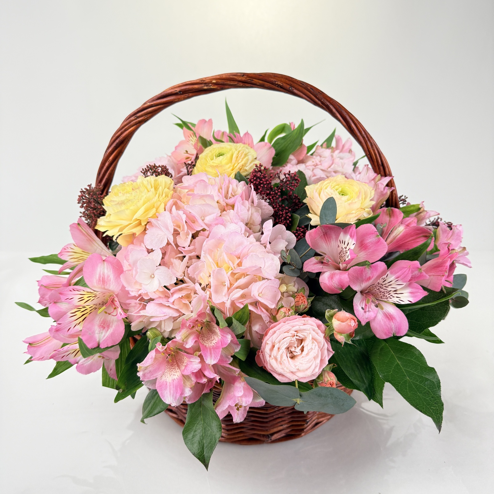 Состав: альстромерия 6, гортензия 3, ранункулюс 3, эвкалипт 2, вибурнум 2, роза кустовая 1 и прочее. в наличии