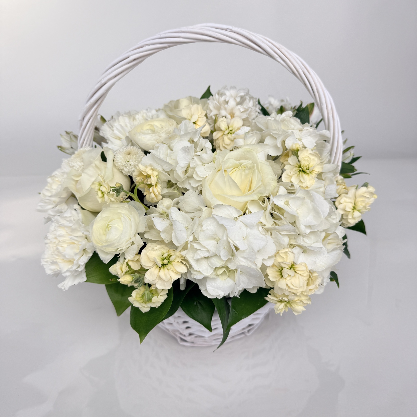 Состав: роза 5, гвоздика 3, маттиола 3, ранункулюс 2, гиацинт 2, альстромерия 2, гортензия 1, рускус 0,5 и прочее.