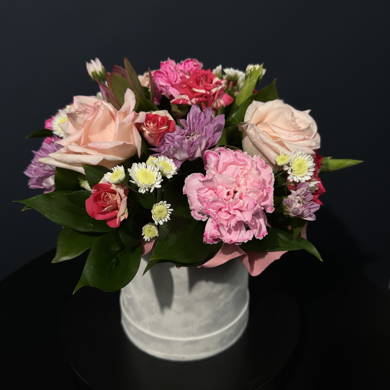 Состав: роза 3, гвоздика 3, хризантема кустовая 2, роза кустовая 1, леукадендрон 1, рускус 0,3 и прочее. в наличии
