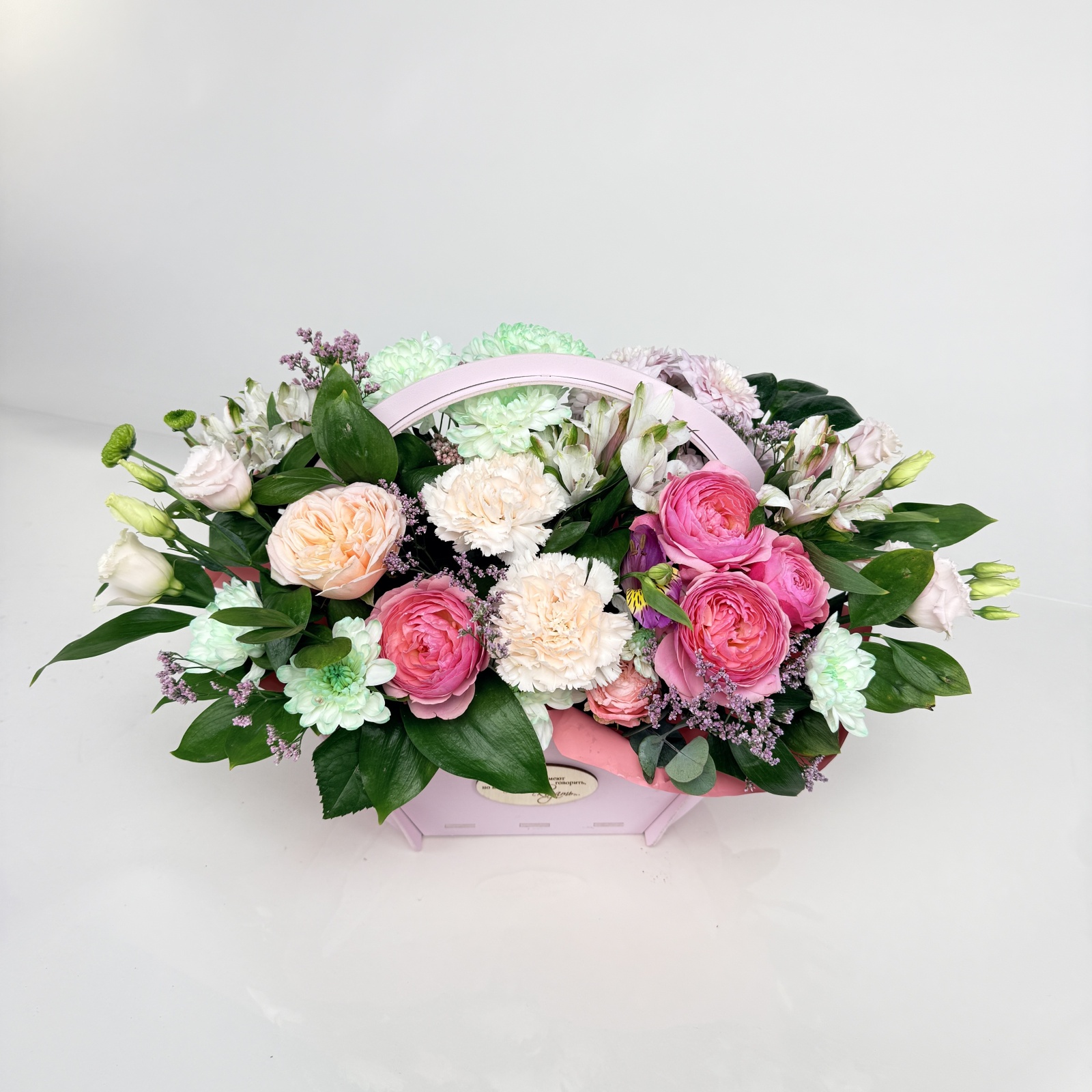 Состав: альстромерия 3, гвоздика 3, хризантема кустовая 2, роза кустовая 1, роза 1, лизиантус 1, рускус 0,5 и прочее.