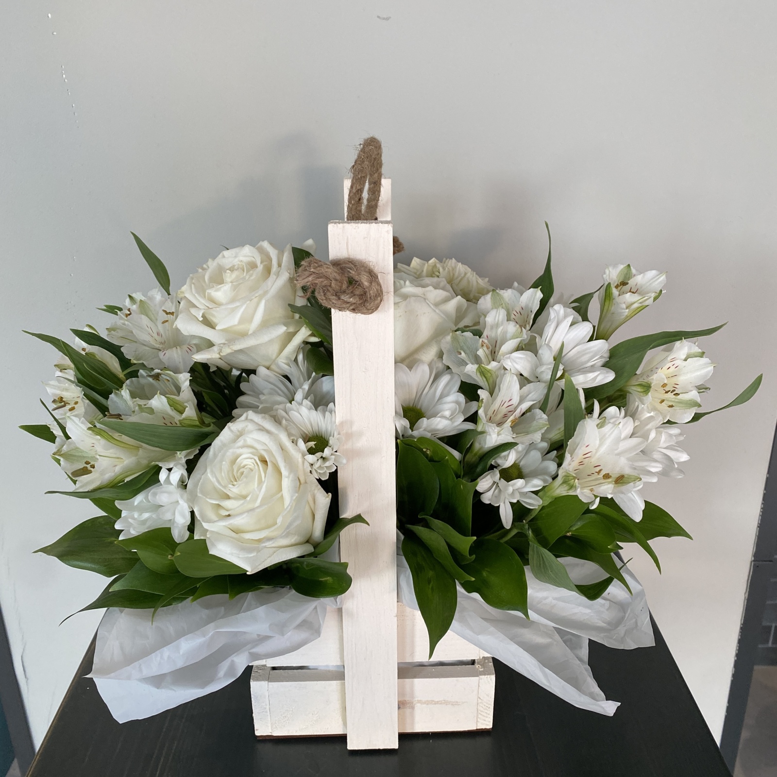 Состав: роза 3, альстромерия 3, роза кустовая 2, хризантема кустовая 2, рускус 0,3 и прочее. под заказ