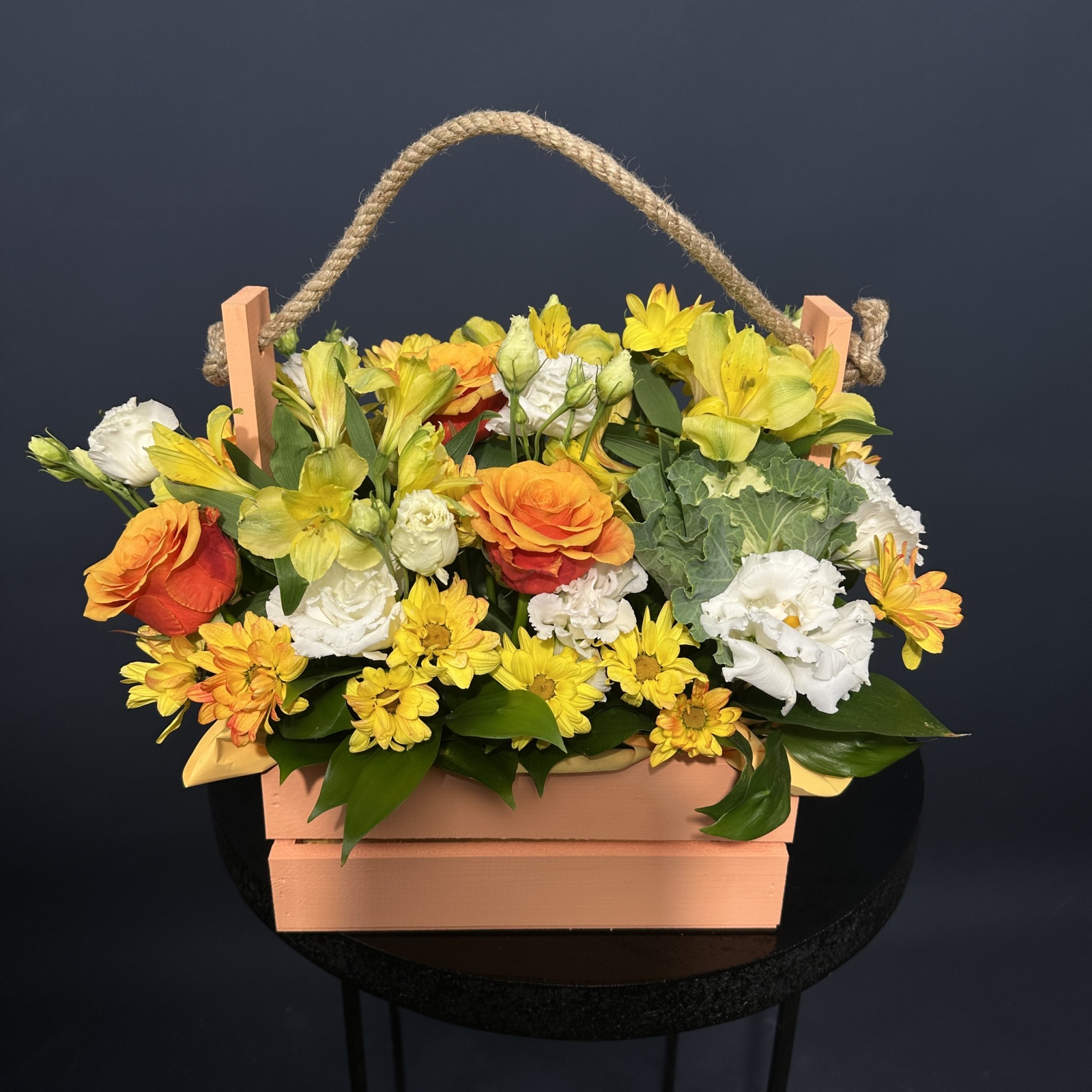Состав: альстромерия 3, хризантема кустовая 3, роза 2, лизиантус 2, рускус 1 и прочее. под заказ