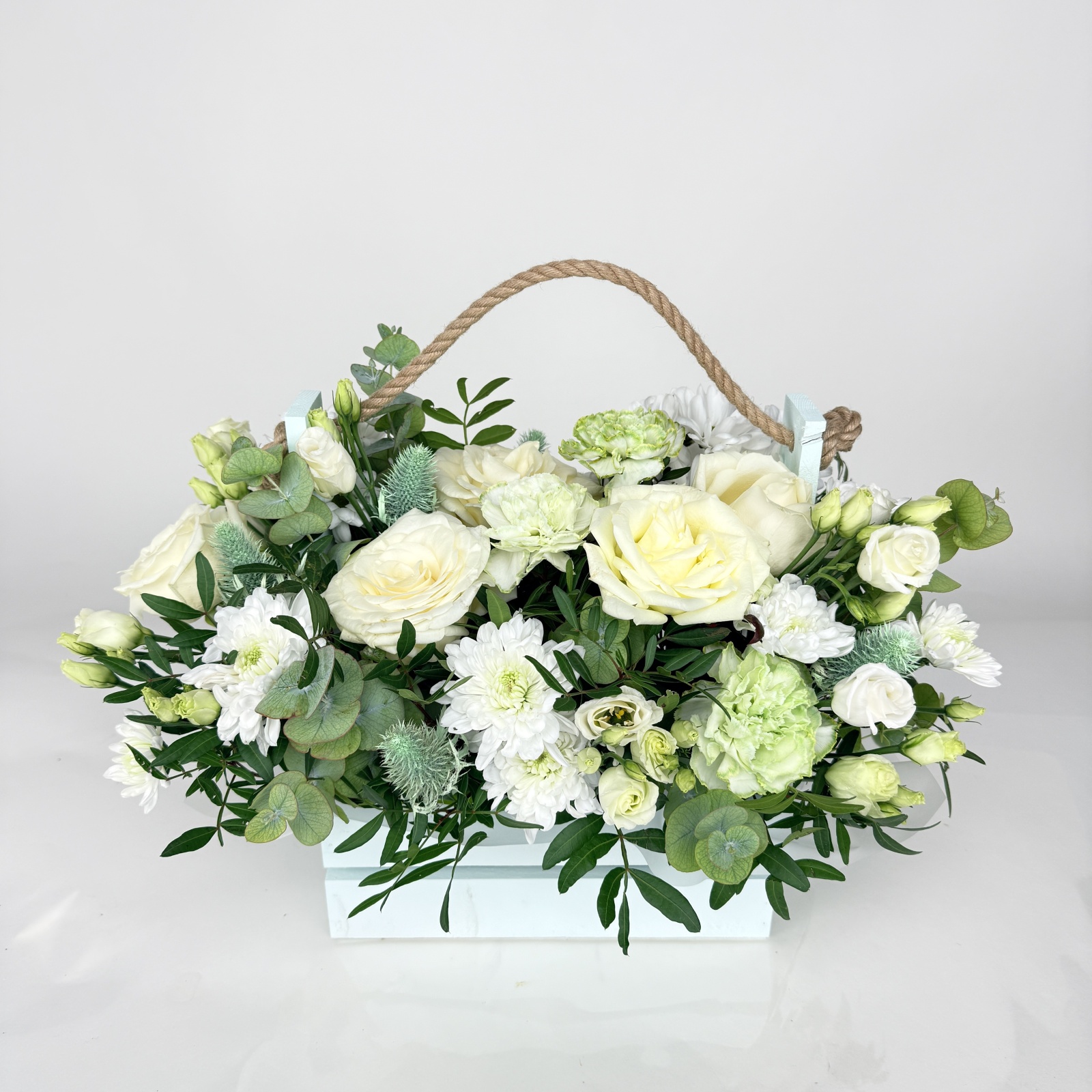 Состав: роза 6, гвоздика 3, хризантема кустовая 2, эрингиум 1, фисташка 0,3 и прочее. под заказ