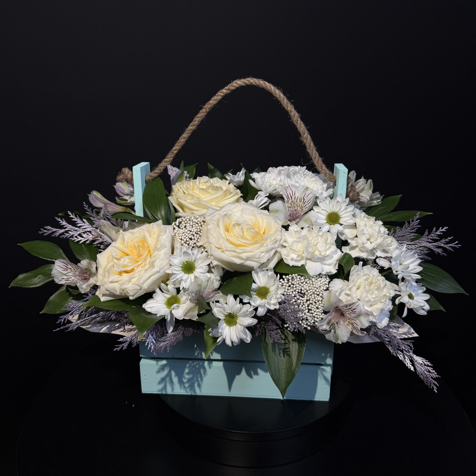 Состав: роза 4, альстромерия 3, гвоздика 3, хризантема кустовая 1, хризантема 1, рускус 0,5 и прочее. в наличии