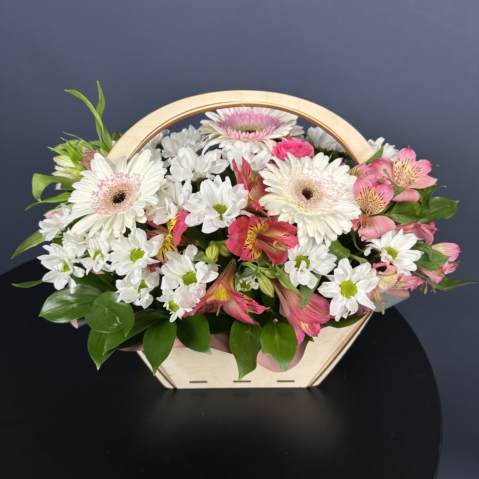 Состав: хризантема кустовая 3, гербера 3, альстромерия 2, хризантема 2, рускус 1 и прочее. под заказ
