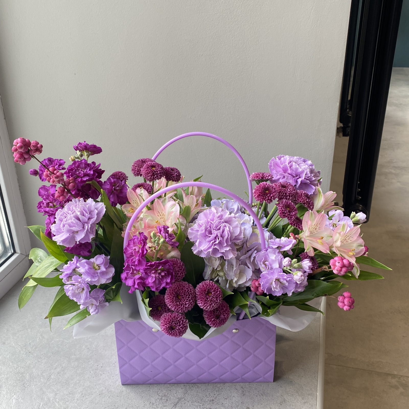 Состав: хризантема 3, альстромерия 3, гвоздика 3, эвкалипт 2, гортензия 1, маттиола 1 и прочее.