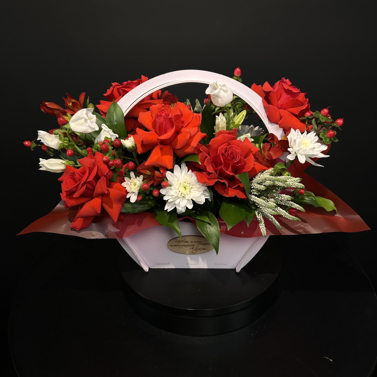 Состав: роза 4, альстромерия 2, гиперикум 2, хризантема кустовая 1 и прочее.