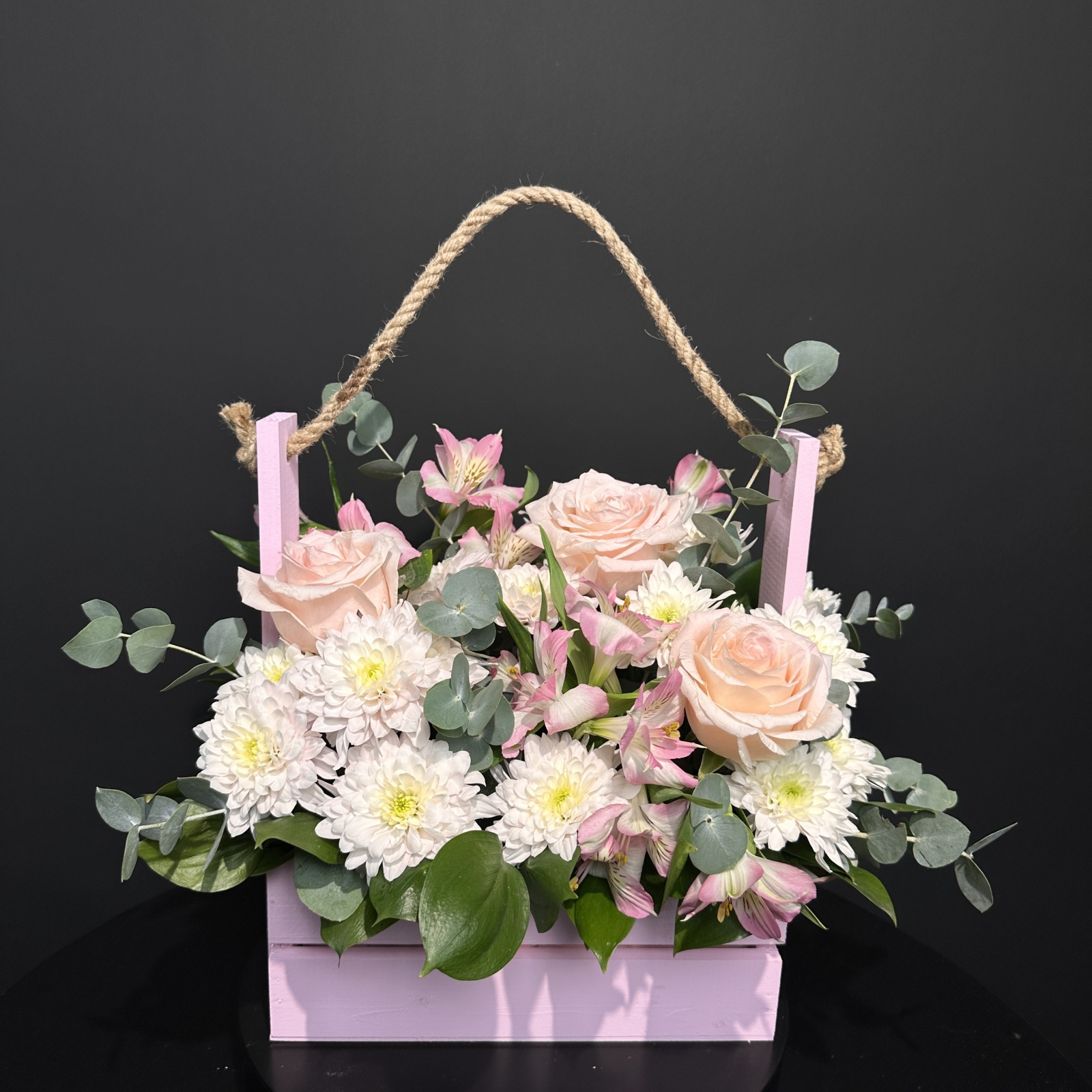 Состав: роза 3, альстромерия 2, хризантема кустовая 2, роза кустовая 1, эвкалипт 1, рускус 0,5 и прочее. под заказ