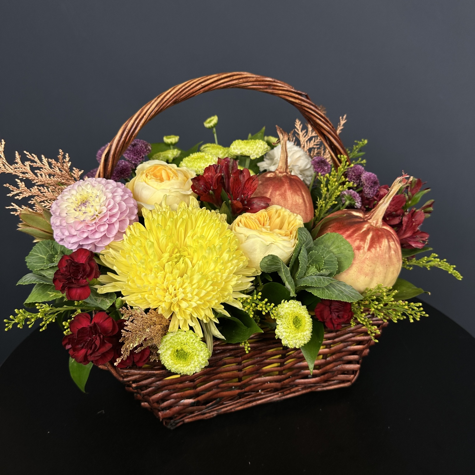 Состав: хризантема 3, роза 3, альстромерия 2, хризантема кустовая 2, гвоздика 1 и прочее.
