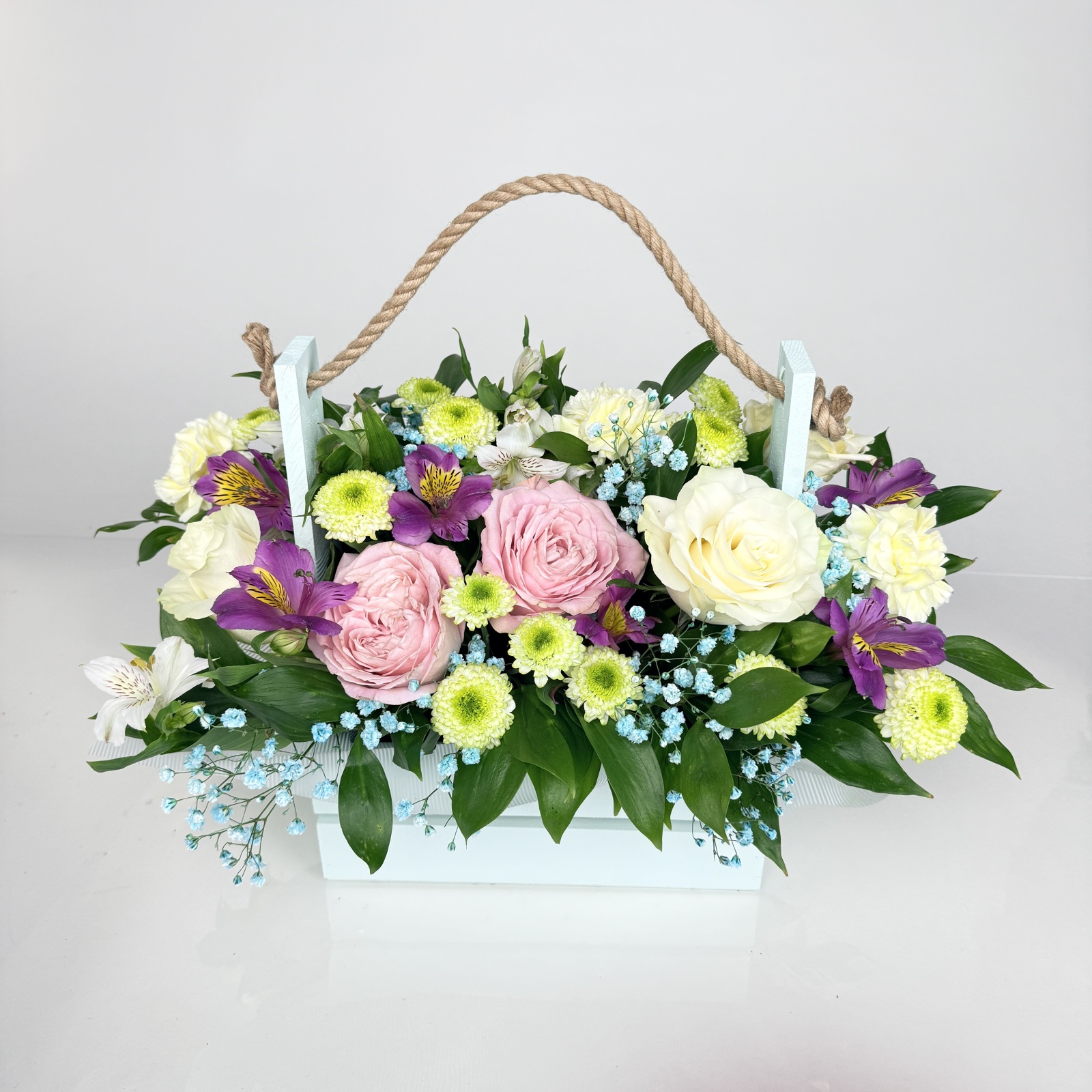 Состав: роза 8, альстромерия 4, гвоздика 3, рускус 0,5 и прочее. в наличии