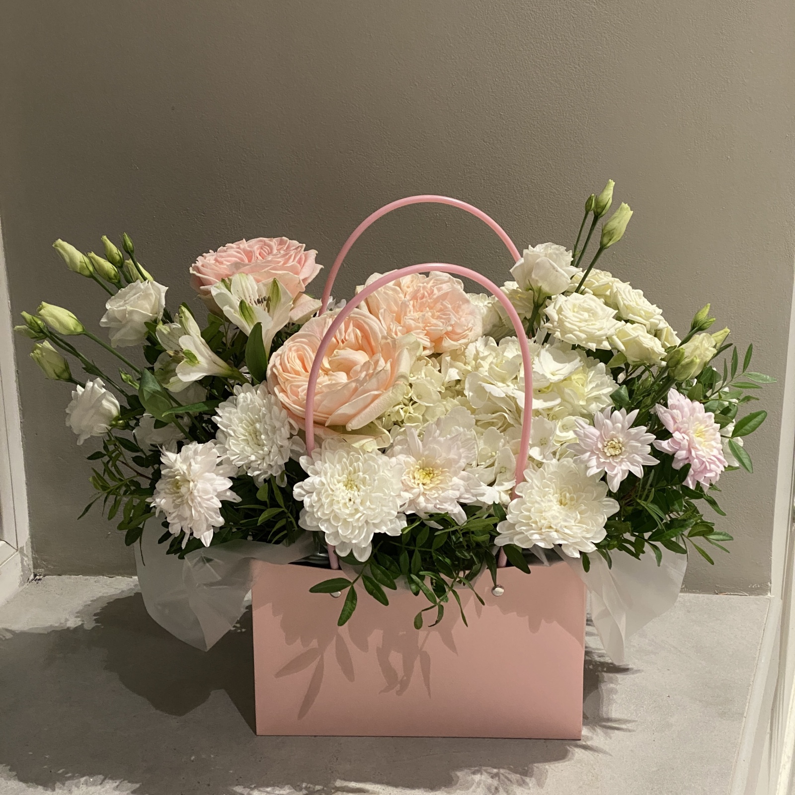 Состав: роза 3, хризантема кустовая 2, гортензия 1, альстромерия 1, роза кустовая 1, лизиантус 1, рускус 0,3 и прочее. под заказ