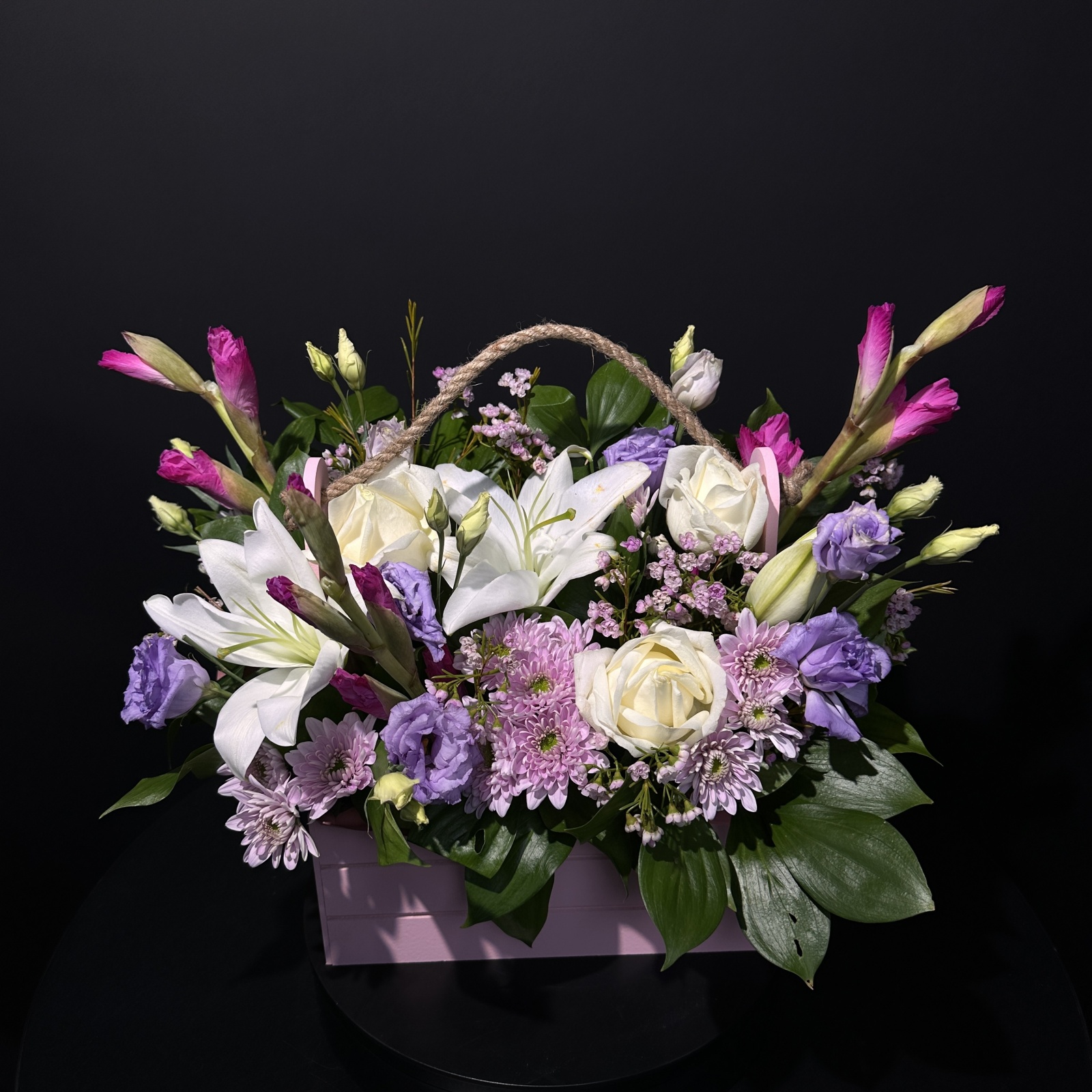 Состав: роза 3, гладиолус 2, лизиантус 2, лилия 1, хризантема кустовая 1, рускус 0,5 и прочее. под заказ