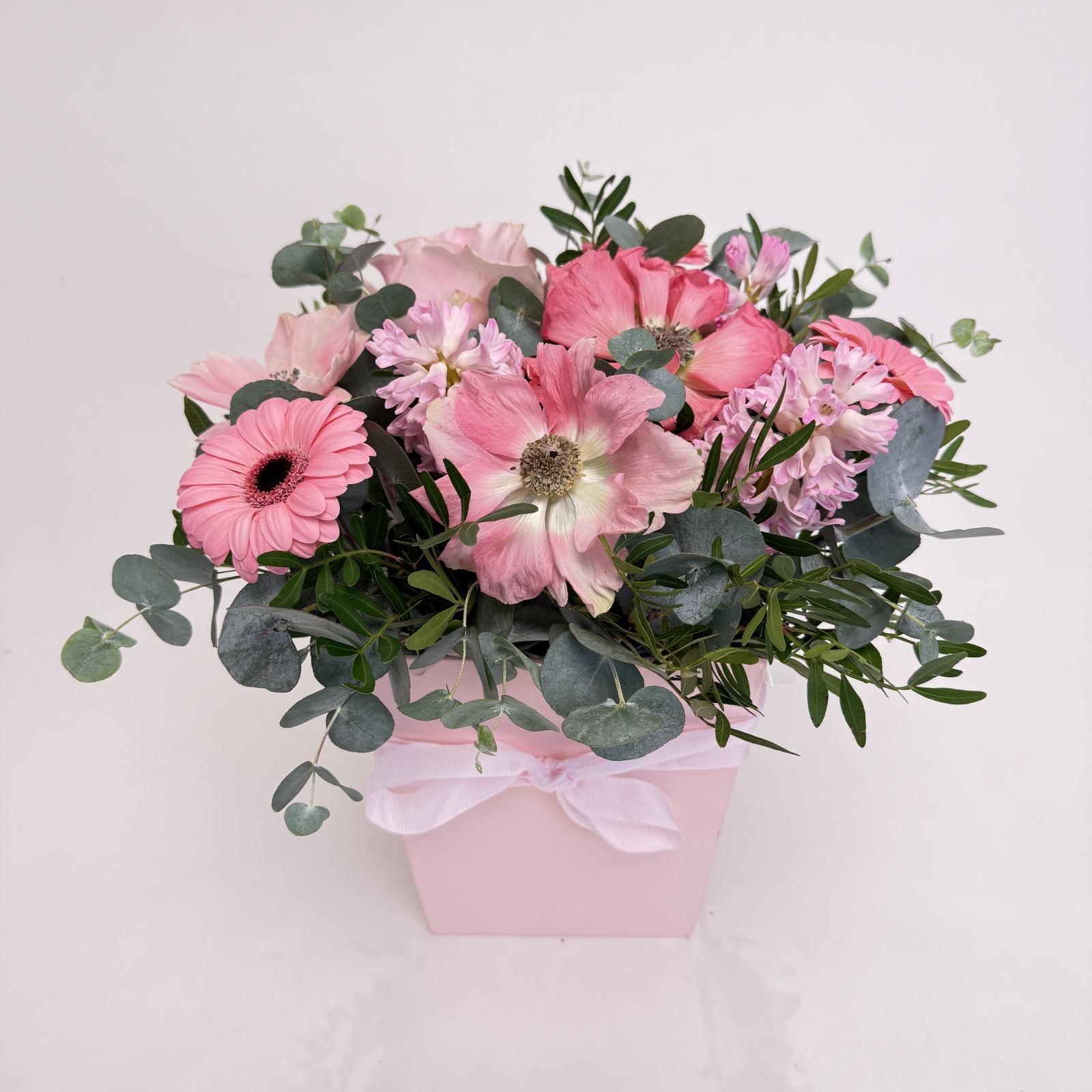 Состав: гербера 3, анемон 3, гиацинт 3, роза 1, роза кустовая 1 и прочее.