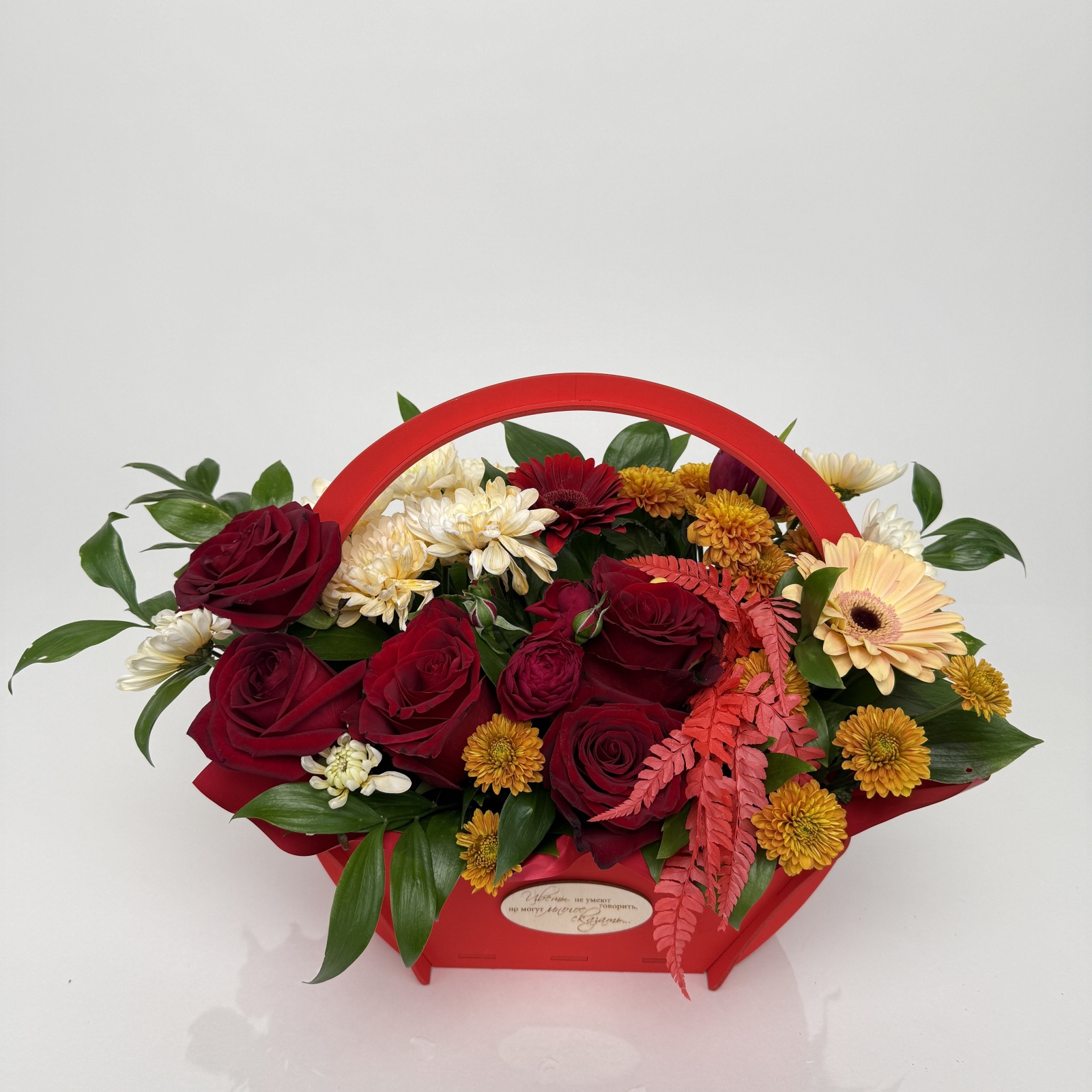 Состав: роза 5, хризантема кустовая 2, гербера 2, тюльпан 1, рускус 0,5 и прочее. в наличии