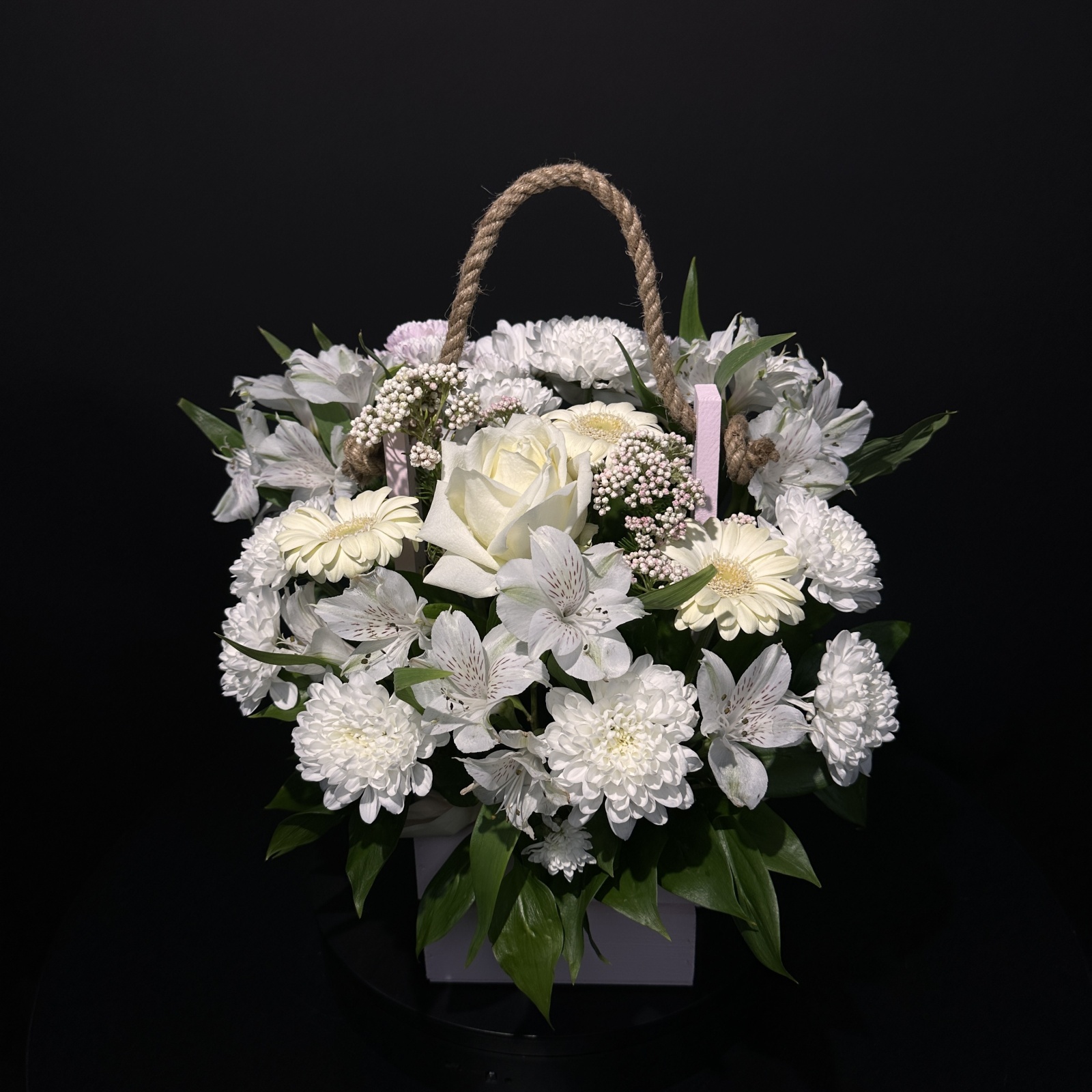 Состав: альстромерия 3, гербера 3, хризантема 2, роза 1, хризантема кустовая 1, рускус 0,5 и прочее.