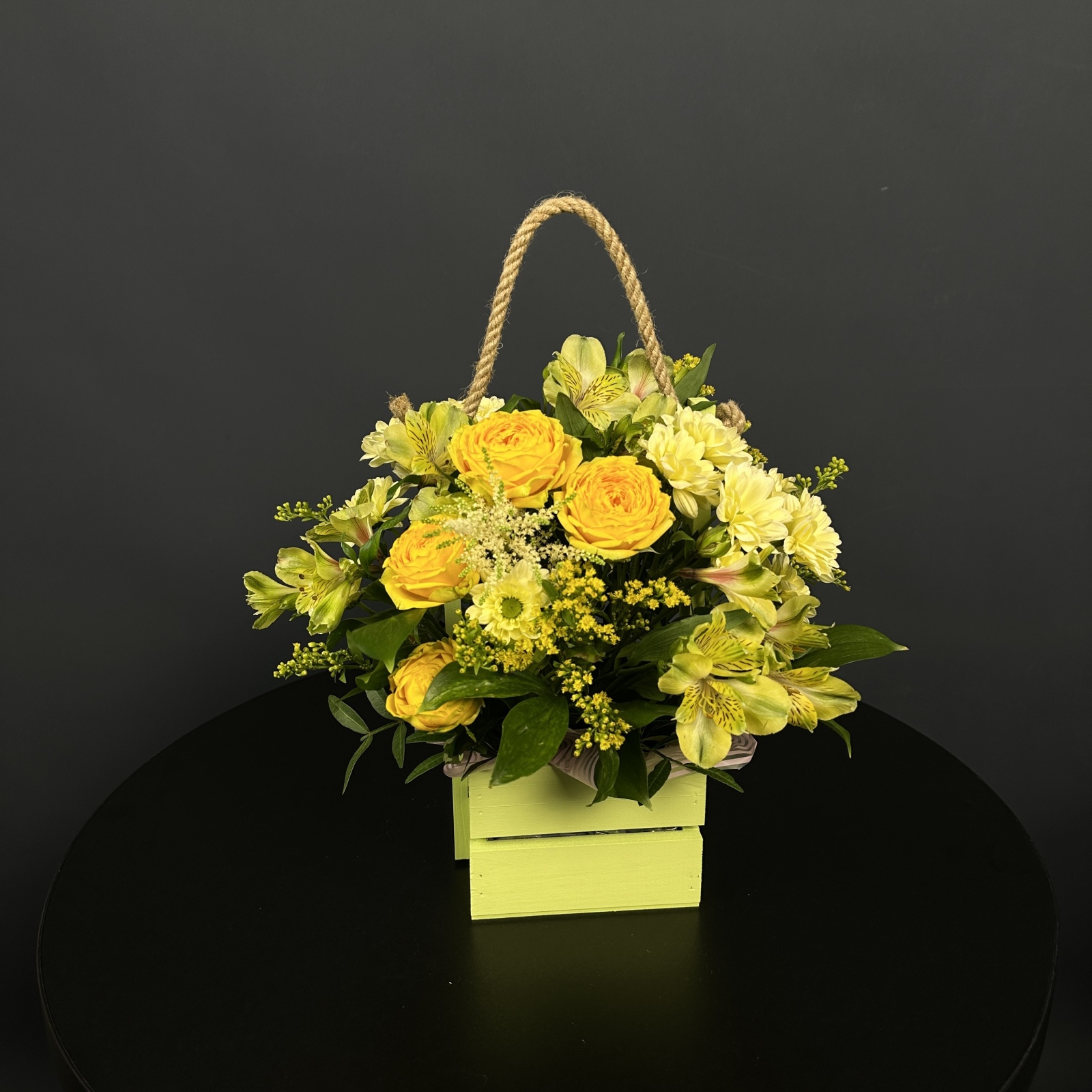 Состав: альстромерия 3, роза кустовая 2, хризантема кустовая 2, рускус 2, солидаго 2, астильба 1, фисташка 0,1 и прочее. под заказ