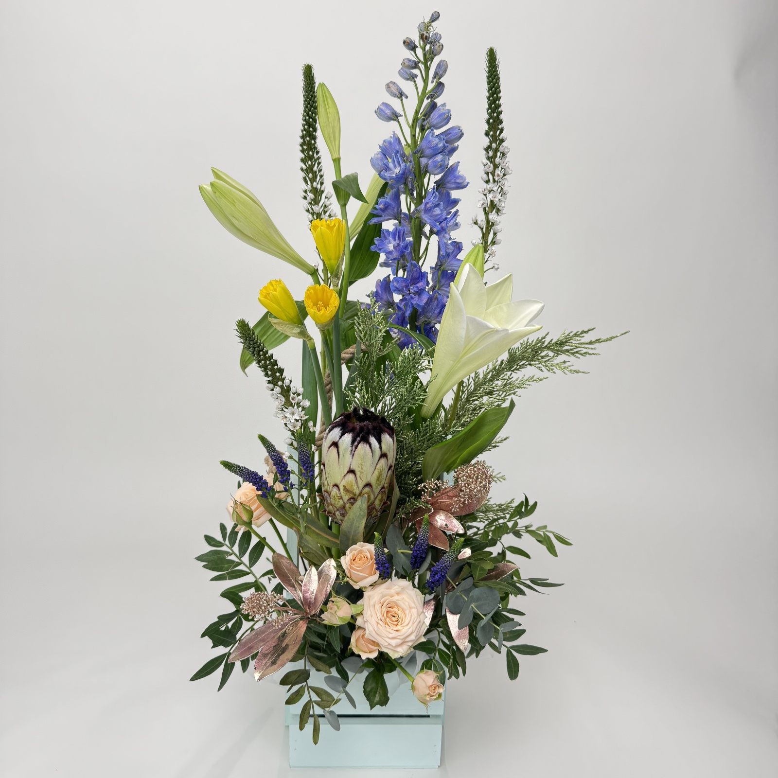 Состав: лизимахия 3, лилия 2, дельфиниум 1, фисташка 0,25 и прочее. под заказ