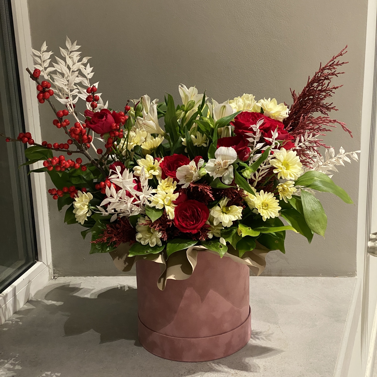 Состав: рускус 3,5, альстромерия 2, роза кустовая 1, хризантема кустовая 1 и прочее.