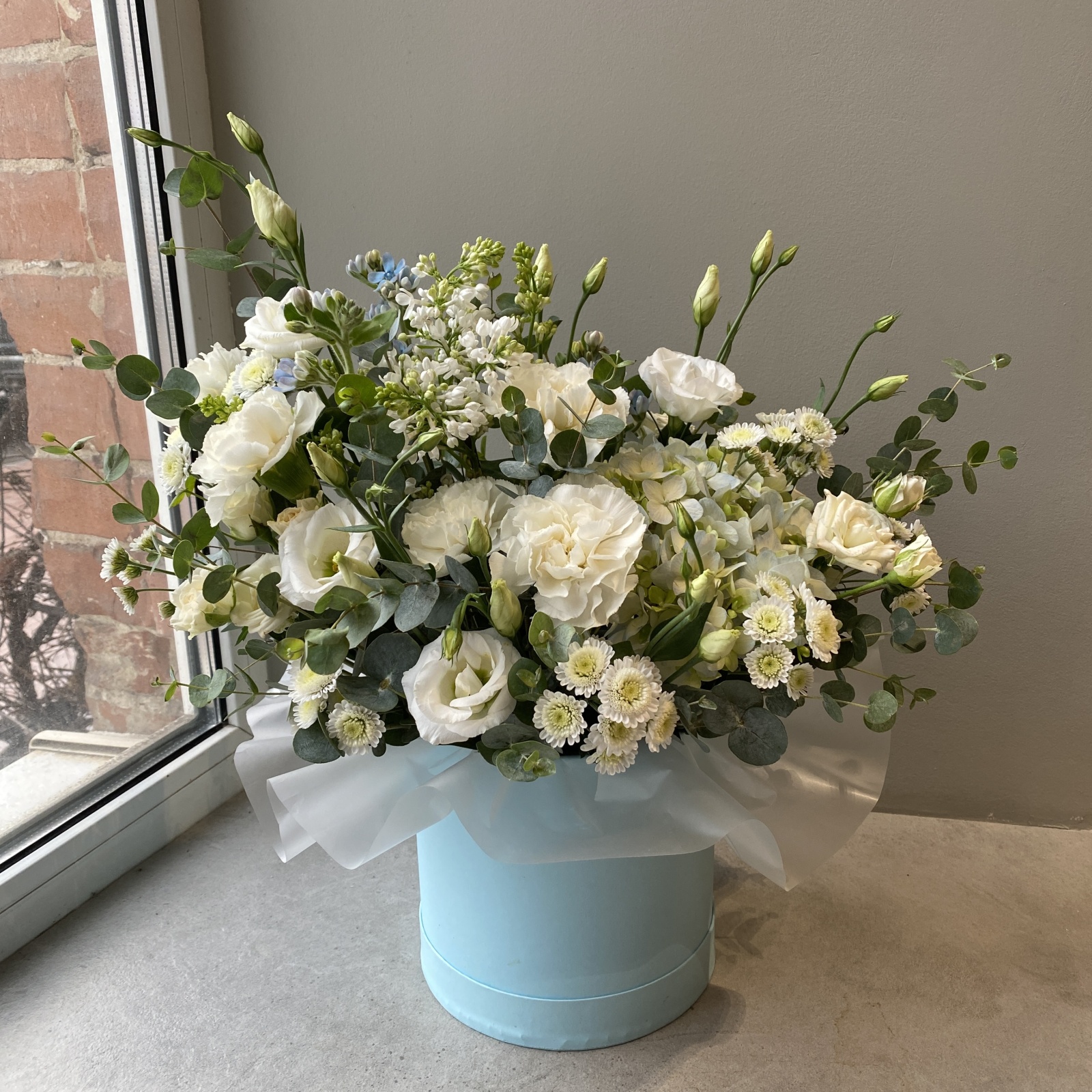 Состав: гвоздика 5, оксипеталум 3, эвкалипт 2, сирень 1, роза кустовая 1, хризантема кустовая 1, гортензия 1, лизиантус 1 и прочее. под заказ