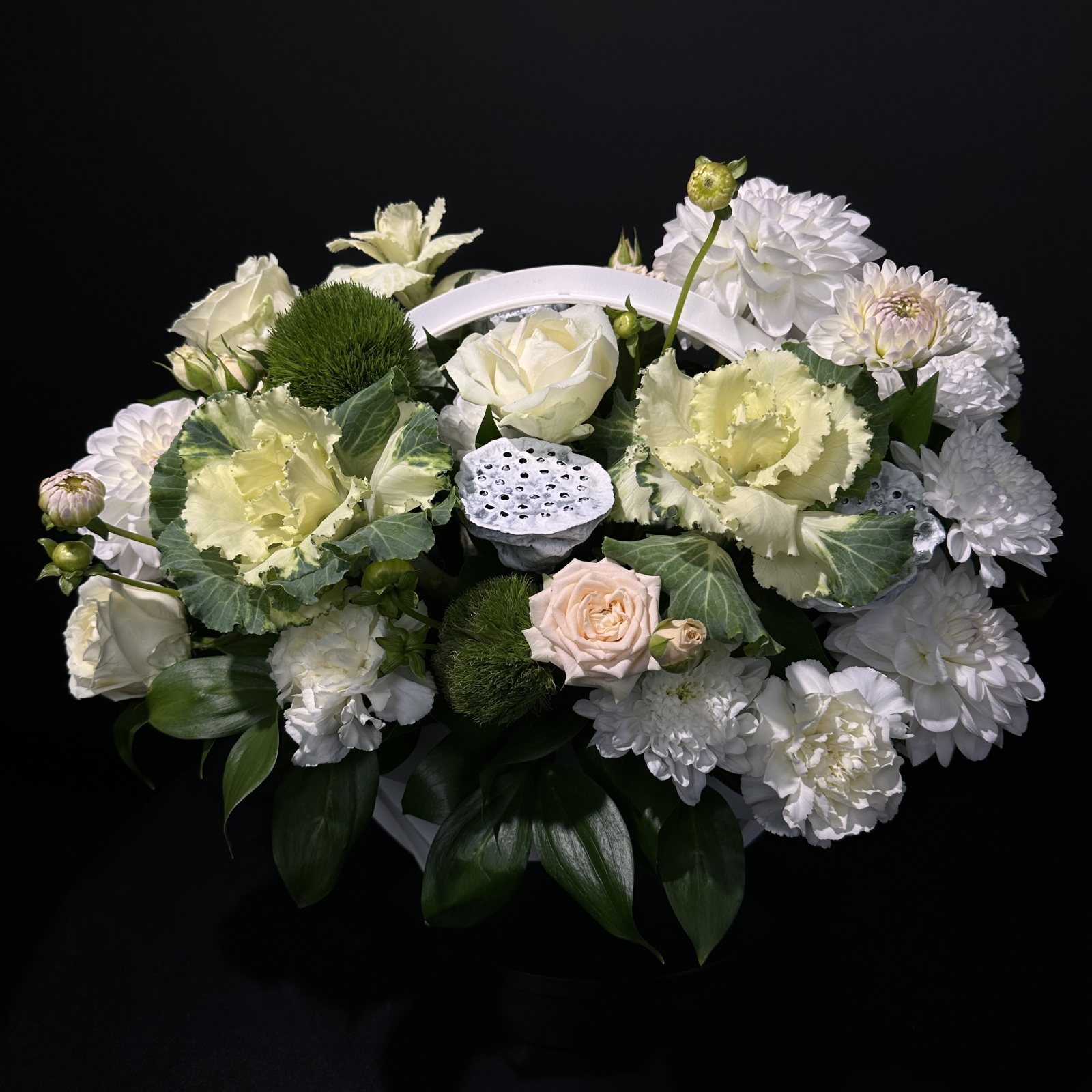 Состав: гвоздика 3,5, роза 2, хризантема кустовая 1, рускус 0,5 и прочее. под заказ